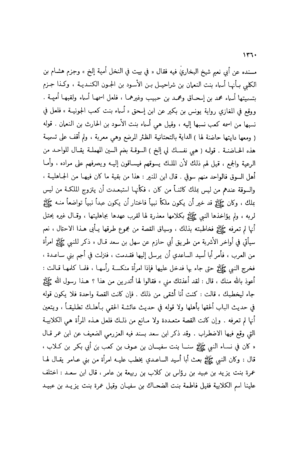مسنده عن أبي نعيم شيخ البخاري فيه فقال "في بيت في النخل أميمة إلخ" وجزم هشام بن الكلبي بأنها أسماء بنت النعمان بن شراحيل بن الأسود بن الجون الكندية، وكذا جزم بتسميتها أسماء محمد بن إسحاق ومحمد بن حبيب وغيرهما، فلعل اسمها أسماء ولقبها أميمة. ووقع في المغازي رواية يونس بن بكير عن ابن إسحق" أسماء بنت كعب الجونية" فلعل في نسبها من اسمه كعب نسبها إليه، وقيل هي أسماء بنت الأسود بن الحارث بن النعمان. قوله (ومعها دايتها حاضنة لها) الداية بالتحتانية الظئر المرضع وهي معربة، ولم أقف على تسمية هذه الحاضنة. قوله (هبي نفسك لي إلخ) السوقة بضم السين المهملة يقال للواحد من الرعية والجمع، قيل لهم ذلك لأن الملك يسوقهم فيساقون إليه ويصرفهم على مراده، واما أهل السوق فالواحد منهم سوقي. قال ابن المنير: هذا من بقية ما كان فيها من الجاهلية، والسوقة عندهم من ليس بملك كائناً من كان، فكأنه استبعدت أن يتزوج الملكة من ليس بملك، وكان صلى الله عليه وسلم قد خير أن يكون ملكاً نبياً فاختار أن يكون عبداً نبياً تواضعاً منه صلى الله عليه وسلم لربه، ولم يؤاخذها النبي صلى الله عليه وسلم بكلامها معذرة لها لقرب عهدها بجاهليتها، وقال غيره يحتمل أنها لم تعرفه صلى الله عليه وسلم فخاطبته بذلك، وسياق القصة من مجموع طرقها يأبى هذا الاحتمال، نعم سيأتي في أواخر الأشربة م طريق أبي حازم عن سهل بن سعد قال "ذكر للنبي صلى الله عليه وسلم امرأة من العرب، فأمر أبا أٍيد الساعدي أن يرسل إليها فقدمت، فنزلت في أجم بني ساعدة، فخرج النبي صلى الله عليه وسلم حتى جاء بها فدخل عليها فإذا امرأة منكسة رأسها، فلما كلمها قالت: أعوذ بالله منك، قال: لقد أعذتك مني" فقالوا لها أتدرين من هذا؟ هذا رسول الله صلى الله عليه وسلم جاء ليخطبك، قالت: كنت أنا أشقى من ذلك. فإن كانت القصة واحدة فلا يكون قوله في حديث الباب ألحقها بأهلها ولا قوله في حديث عائشة الحقي بأهلك تطليقاً، ويتعين أنها لم تعرفه. وإن كانت القصة متعددة ولا امنع من ذلك فلعل هذه المرأة هي الكلابية التي وقع فيها الاضطراب. وقد ذكر ابن سعد بسند فيه العزرمي الضعيف عن ابن عمر قال "كان في نساء النبي صلى الله عليه وسلم سنا بنت سفيان بن عوف بن كعب بن أبي بكر بن كلاب، قال: وكان النبي صلى الله عليه وسلم بعث أبا أسيد الساعدي يخطب عليه امرأة من بني عامر يقال لها عمرة بنت يزيد بن عبيد بن رؤاس بن كلاب بن ربيعة بن عامر، قال ابن سعد: اختلف عينا اسم الكلابية فقيل فاطمة بنت الضحاك بن سفيان وقيل عمرة بنت يزيد بن عبيد