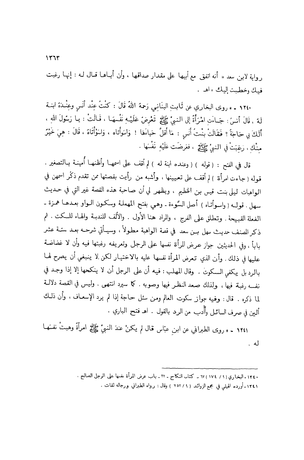 1240 - * روى البخاري عن ثابت البناني رحمه الله قال: كنت عند أنس وعنده ابنة له، قال أنس: جاءت امرأة إلى النبي صلى الله عليه وسلم تعرض عليه نفسها، قالت: يا رسول الله، ألك بي حاجة؟ فقالت بنت أنس: ما أقل حياءها! واسوأتاه، واسوأتاه، قال: هي خيرٌ منك، رغبت في النبي صلى الله عليه وسلم، ففرضت عليه نفسها.