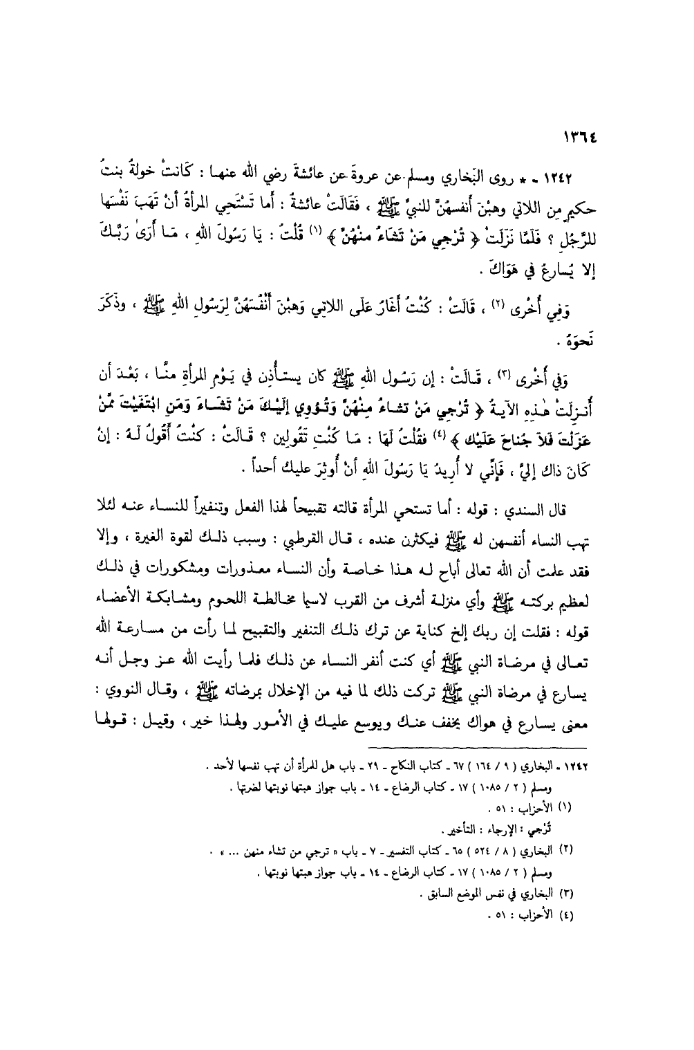 1242 - * روى البخاري ومسلم عن عروة عن عائشة رضي الله عنها: كانت خولة بنت حكيم من اللاتي وهبن أنفسهن للنبي صلى الله عليه وسلم، فقالت عائشة: أما تستحي المرأة أن تهب نفسها للرجل؟ فلما نزلت {تُرْجِي مَنْ تَشَاءُ مِنْهُنَّ} (1) قلت: يا رسول الله، ما أرى ربك إلا يسارع في هواك.