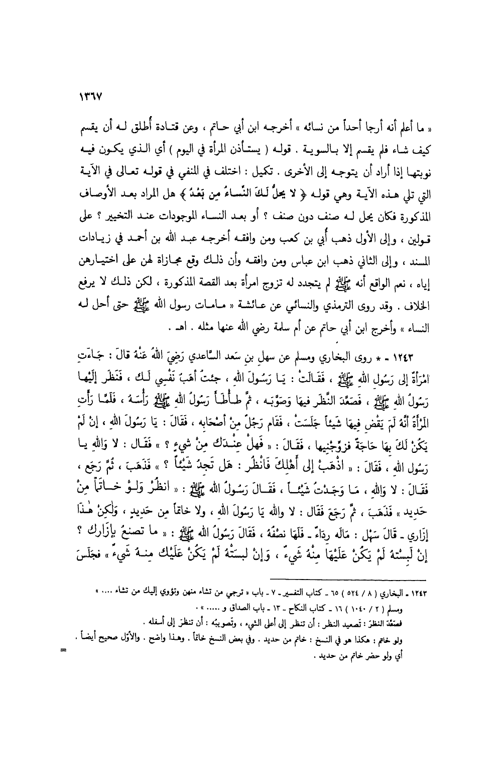 1243 - * روى البخاري ومسلم عن سهل بن سعد الساعدي رضي الله عنه قال: جاءت امرأة إلى رسول الله صلى الله عليه وسلم، فقالت: يا رسول الله، جئت أهب نفسي لك، فنظر إليها رسول الله صلى الله عليه وسلم، فصعد النظر فيها وصوبه، ثم طأطأ رسول الله صلى الله عليه وسلم رأسهُ، فلما رأت المرأة أنه لم يقض فيها شيئاً جلستْ، فقام رجل من أصحابه، فقال: يا رسول الله، إن لم يكن لك بها حاجة فزوجنيها، فقال: "فهل عندك من شيءٍ؟ " فقال: لا والله يا رسول الله، فقال: "اذهب إلى أهلك فانظُر: هل تجد شيئاً؟ " فذهب، ثم رجع، فقال: لا والله، ما وجدت شيئاً، فقال رسول الله صلى الله عليه وسلم: "انظر ولو خاتماً من حديد" فذهب، ثم رجع فقال: لا والله يا رسول الله، ولا خاتماً من حديدٍ، ولكن هذا إزاري- قال سهل: ماله رداء - فلها نصفه، فقال رسول الله صلى الله عليه وسلم (1): "ما تصنعُ بإزارك؟ إن لبستهُ لم يكن عليها منهُ شيءٌ، وإن لبسَتْهُ لم يكن عليك منه شيءٌ" فجلس