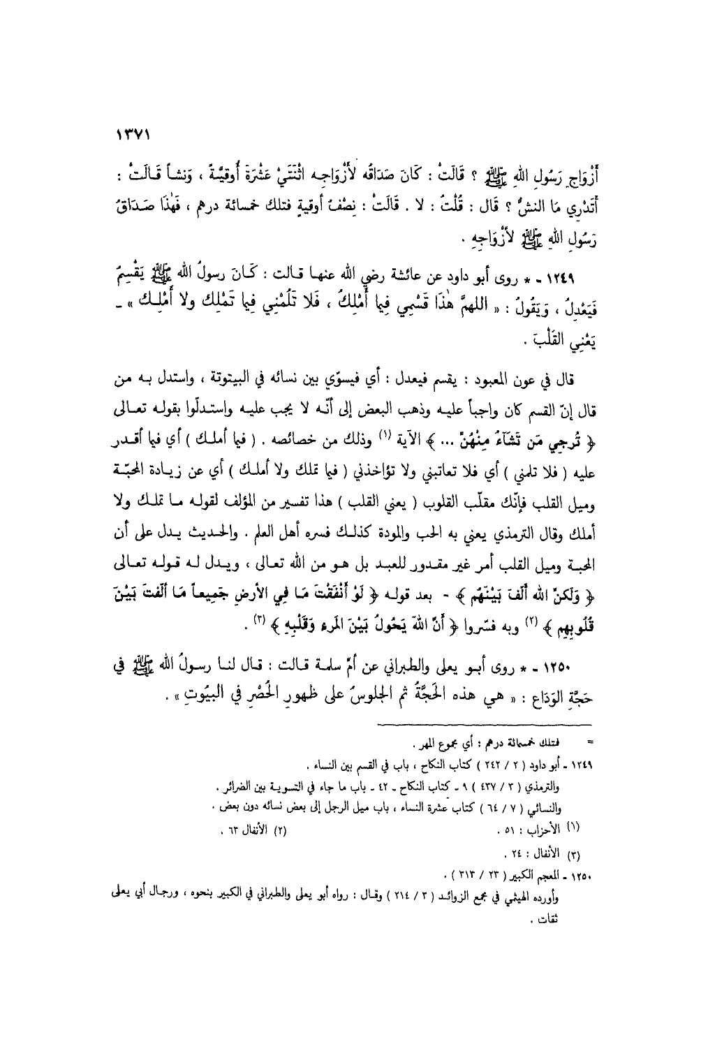 1249 - * روى أبو داود عن عائشة رضي الله عنها قالت: كان رسول الله صلى الله عليه وسلم يُقَّسِمُ فيعدلُ، ويقول: "اللهم هذا قسمي فيما أملكُ، فلا تلمني فيما تملك ولا أملك"- يَعني القلب.
