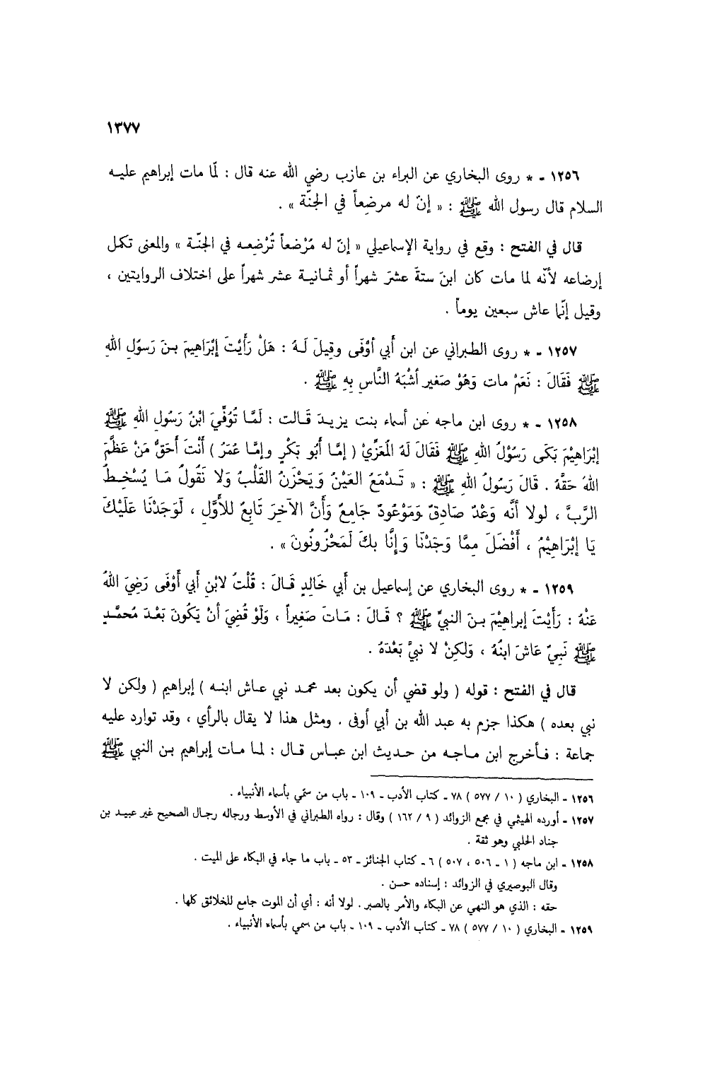 1259 - * روى البخاري عن إسماعيل بن أبي خالدٍ قال: قلت لابن أبي أوفى رضي الله عنه: رأيت إبراهين بن النبي صلى الله عليه وسلم؟ قال: مات صغيراً، ولو قُضي أنْ يكون بعد محمدٍ صلى الله عليه وسلم نبي عاش ابنه، ولكن لا نبي بعدهُ.