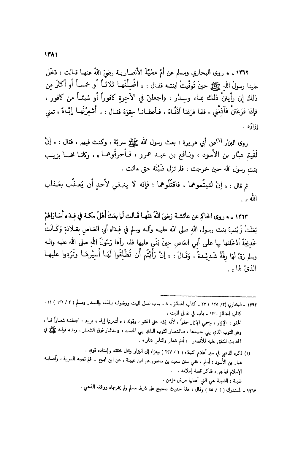 1262 - * روى البخاري ومسلم عن أم عطية الأنصارية رضي الله عنها قالت: دخل علينا رسول الله صلى الله عليه وسلم حين تُوفيت ابنته فقال: "اغسلنها ثلاثاً أو خمساً أو أكثر من ذلك إن رأيتن ذلك بماء وسدر، واجعلن في الآخرة كافوراً أو شيئاً من كافور، فإذا فرغتن فآذنني" فلما فرغنا آذناه، فأعطانا حِقوَهُ فقال: "أشعرنها إياهُ" تعني إزاره.