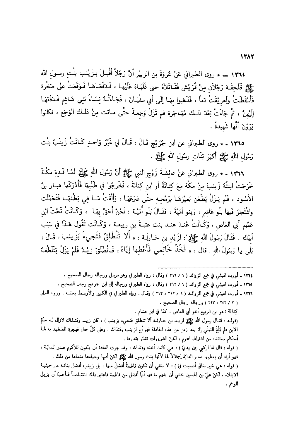 1264 - * روى الطبراني عن عروة بن الزبير أن رجلاً أقبل بزينب بنت رسول الله صلى الله عليه وسلم فلحقهُ رجلان من قريش فقاتلاه حتى غلباهُ عليها، فدفعاها فوقعت على صخرة فأسقطتْ وأهريقتْ دماً، فذهبوا بها إلى أبي سفيان، فجاءتهُ نساء بني هاشم فدفعها إليهن، ثم جاءت بعد ذلك مهاجرة فلم تزل وجعة حتى ماتت من ذلك الوجع، فكانوا يرون أنها شهيدة.