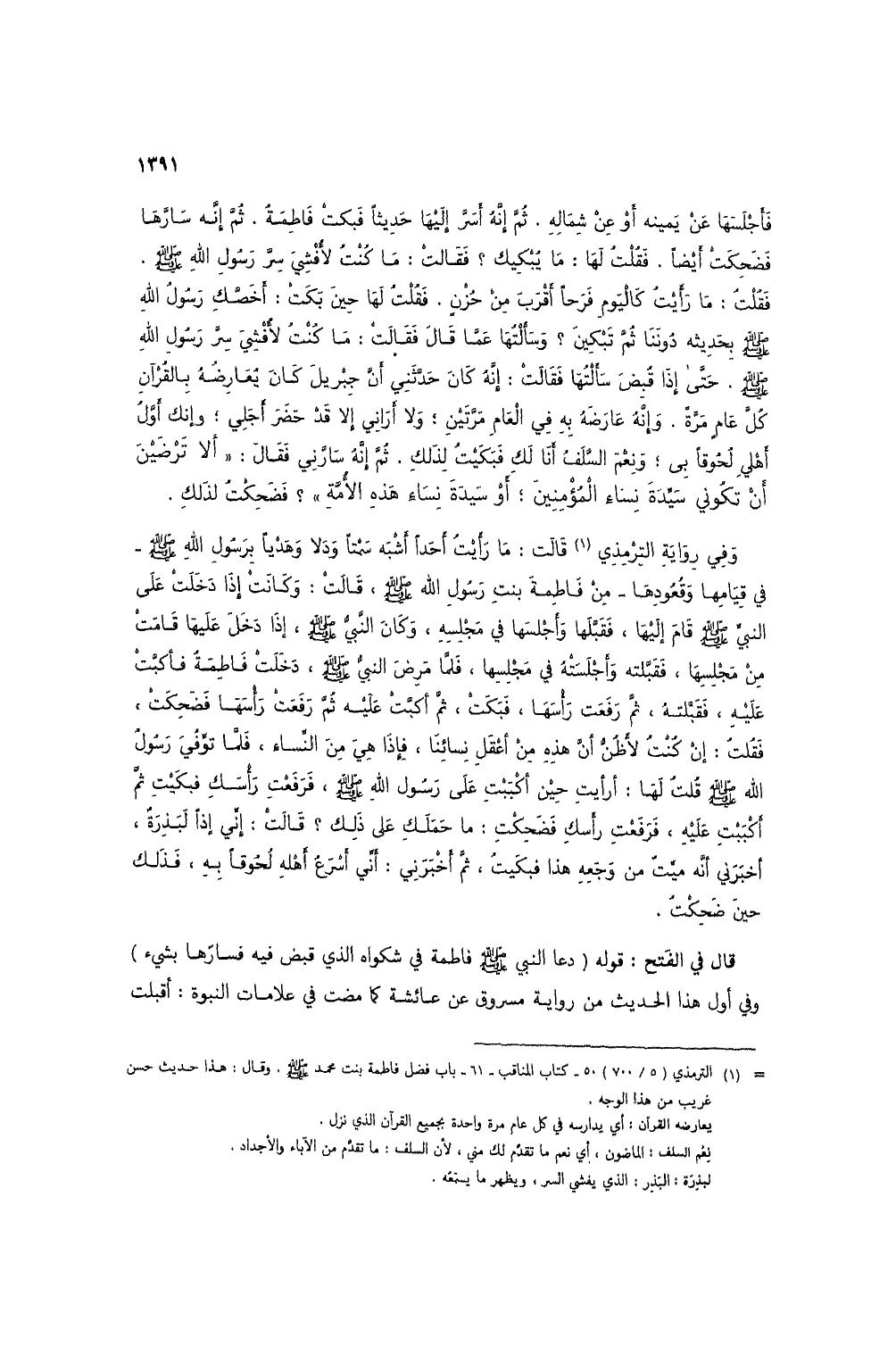فأجلسها عن يمينه أو عن شماله. ثم إنه أسر إليها حديثاً فبكت فاطمة. ثم إنه سارها فضحكت أيضاً. فقلت لها: ما يبكيك؟ فقالت: ما كنت لأفشي سر رسول الله صلى الله عليه وسلم. فقلت: ما رأيت كاليوم فرحاً أقرب من حُزنٍ. فقلت لها حين بكت: أخصكِ رصول الله صلى الله عليه وسلم بحديثه دوننا ثم تبكين؟ وسألتها عما قال فقالت: ما كنت لأفشي سر رسول الله صلى الله عليه وسلم. حتى إذا قُبض سألتها فقالت: إنه كان حدثني أن جبريل كان يعارضه بالقرآن كل عام مرة. وإنه عارضهُ به في العام مرتين؛ ولا أراني إلا قد حضر أجلي؛ وإنك أول أهلي لحوقاً بي؛ ونعم السلفُ أنا لك فبكيتُ لذلك. ثم إنه سارني فقال: "ألا ترضين أن تكوني سيدة نساء المؤمنين؛ أو سيدة نساء هذه الأمة"؟ فضحكتُ لذلك.