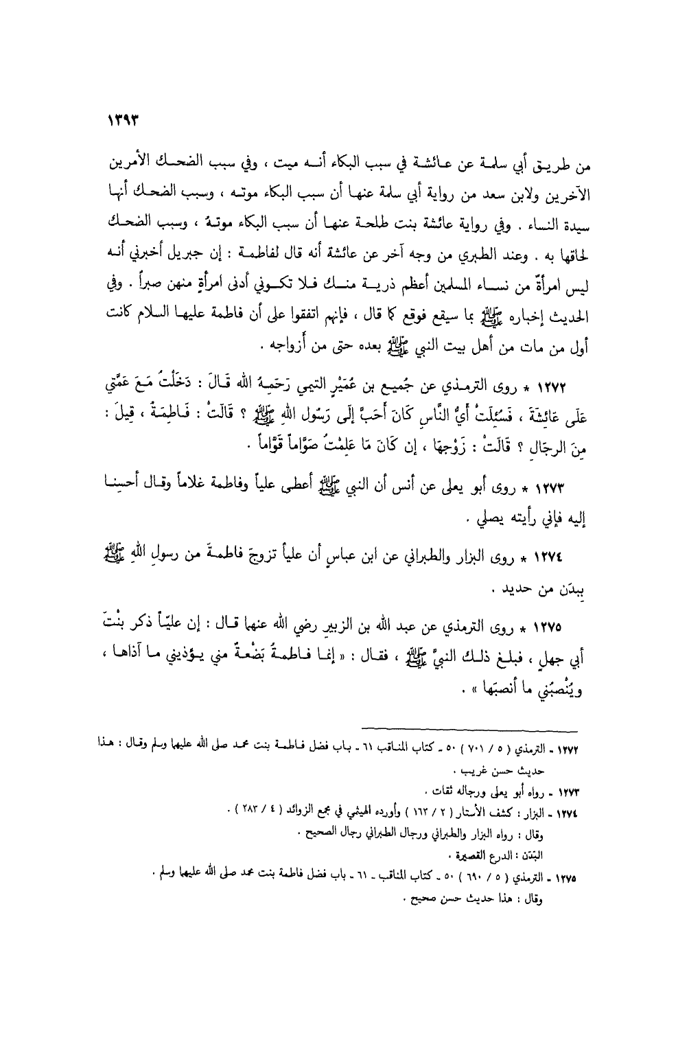 1275 - * روى الترمذي عن عبد الله بن الزبير رضي الله عنهما قال: إن علياً ذكر بنت أبي جهلٍ، فبلغ ذلك النبي صلى الله عليه وسلم، فقال: "إنما فاطمةُ بضعةٌ مني يؤذيني ما آذاها (1)، ويُنْصبُني ما أنصبها".