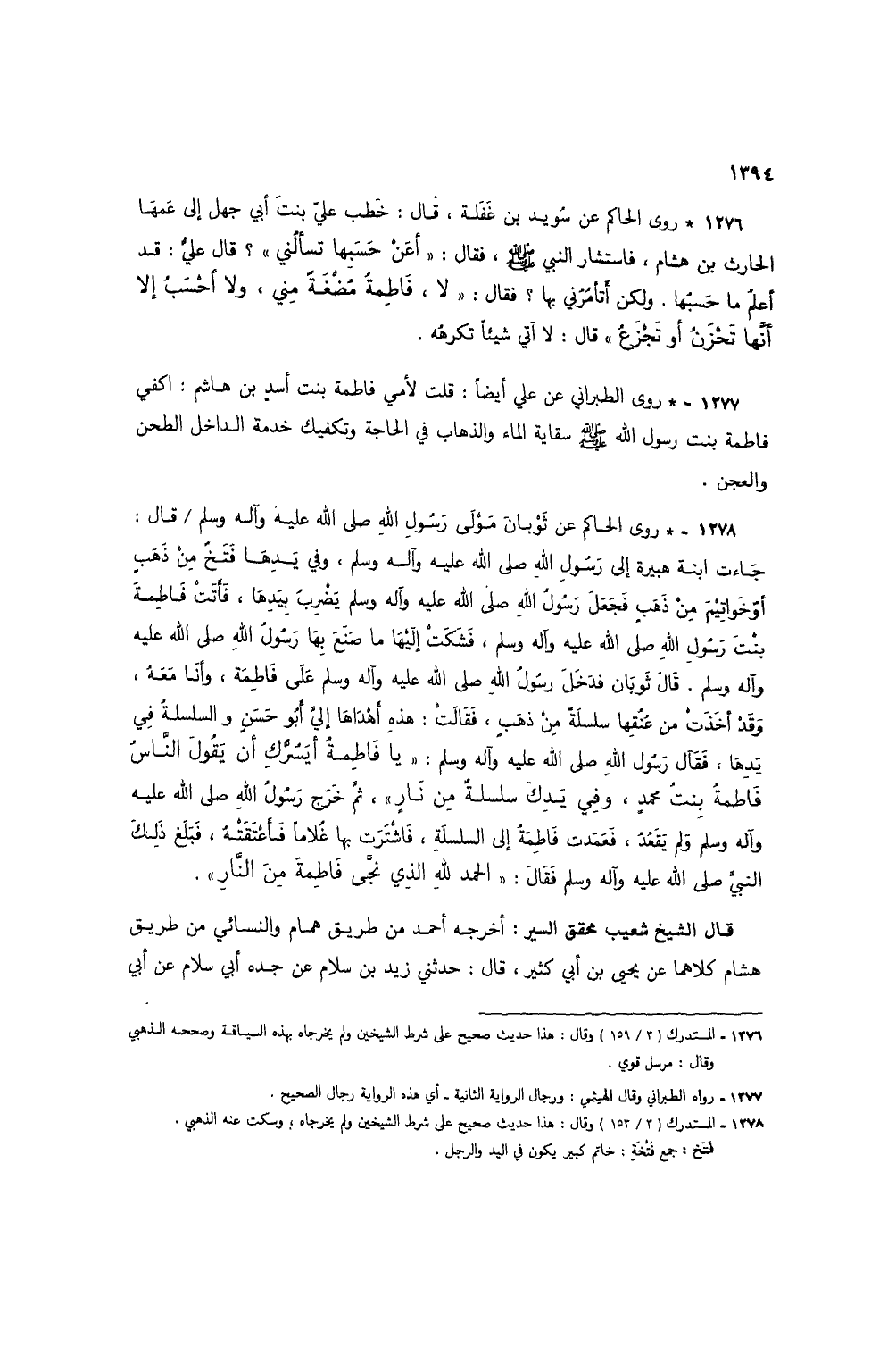 1278 - * روى الحاكم عن ثوبان مولى رسول الله صلى الله عليه وآله وسلم، قال: جاءت ابنة هبيرة إلى رسول الله صلى الله عليه وآله وسلم، وفي يدها فتخٌ من ذهبٍ أو خواتيم من ذهب فجعل رسول الله صلى الله عليه وآله وسلم يضربُ بيدها، فأتتْ فاطمة بنت رسول الله صلى الله عليه وآله وسلم، فشكت إليها ما صنع بها رسول الله صلى الله عليه وآله وسلم. قال ثوبان فدخل رسول الله صلى الله عليه وآله وسلم على فاطمة، وأنا معه، وقد أخذت من عنقها سلسلة من ذهب، فقالت: هذه أهداها إليَّ أبو حسن والسلسلة في يدها، فقال رسول الله صلى الله عليه وآله وسلم: طيا فاطمةُ أيسُرُّكِ أن يقول الناسُ فاطمة بنتُ محمدٍ، وفي يدك سلسلةٌ من نارٍ"، ثم خرج رسول الله صلى الله عليه وآله وسلم ولم يقعد، فعمدت فاطمةُ إلى السلسلة، فاشترت بها غُلاماً فأعتقتهُ، فبلغ ذلك النبي صلى الله عليه وآله وسلم فقال: "الحمد لله الذي نجى فاطمة من النار".