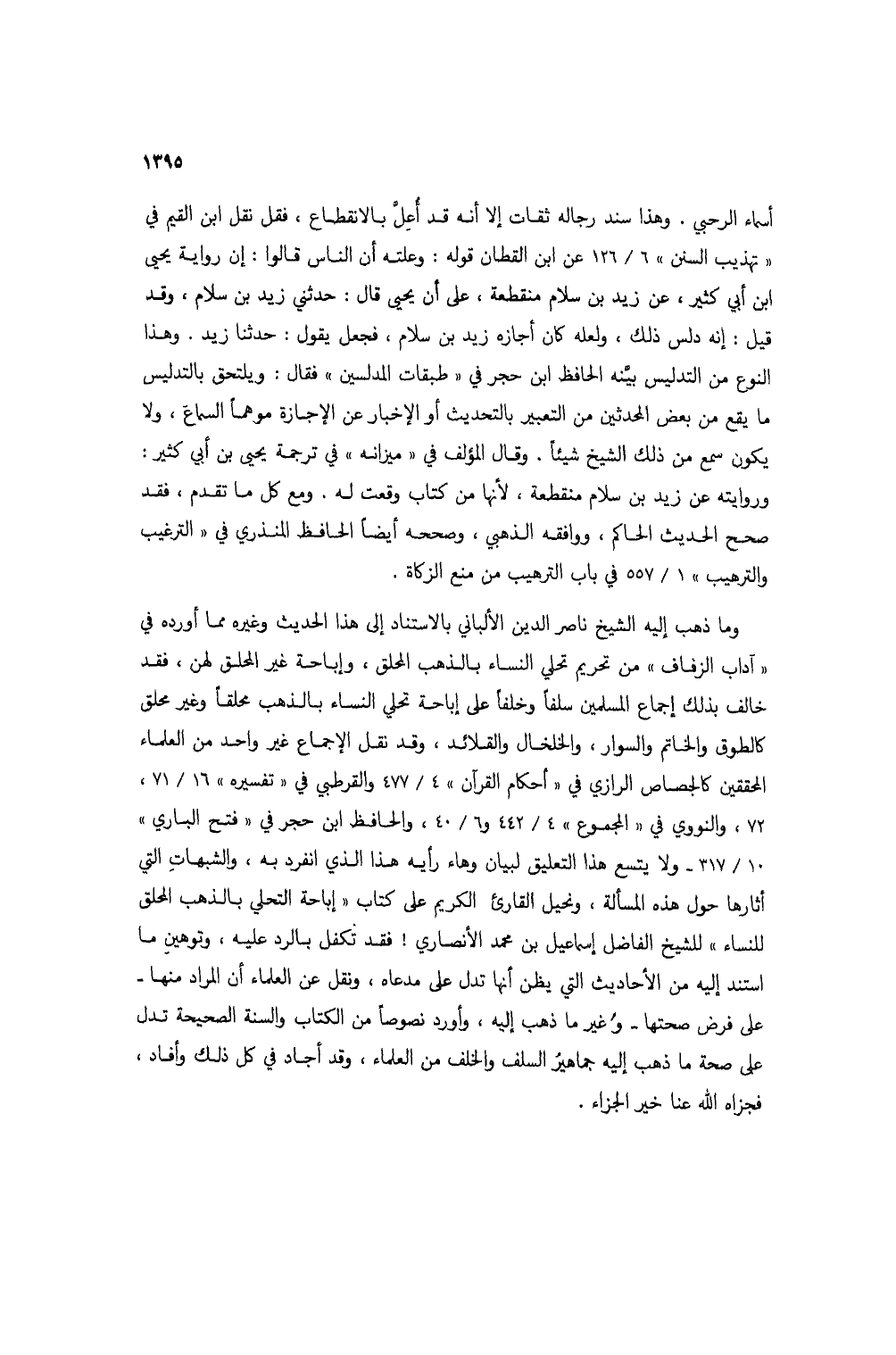 وما ذهب إليه الشيخ ناصر الدين الألباني بالاستناد إلى هذا الحديث وغيره مما أورده في "آداب الزفاف" من تحريم تحلي النساء بالذهب المحلق، وإباحة غير المحل قلهن، فقد خالف بذلك إجماع المسلمين سلفاً وخلفاً على إباحة تحلي النساء بالذهب محلقاً وغير محلق كالطوق والخاتم والسوار، والخلخال والقلائد، وقد نقل الإجماع غير واحد من العلماء المحققين كالجصاص الرازي في "أحكام القرآن" 4/ 477 والقرطبي في "تفسيره" 16/ 71، 72، والنووي في "المجموع" 4/ 442 و 6/ 40، والحافظ ابن حجر في "فتح الباري" 10/ 317 - ولا يتسع هذا التعليق لبيان وهاء رأيه هذا الذي انفرد به، والشبهات التي أثارها حول هذه المسألة، ونحيل القارئ الكريم على كتاب "إباحة التحلي بالذهب المحلق للنساء" للشيخ الفاضل إسماعيل بن محمد الأنصاري! فقد تكفلبالرد عليه، وتوهين ما استند إليه من الأحاديث التي يظن أنها تدل على مدعاه، ونقل عن العلماء أن المراد منها - على فرض صحتها - وغير ما ذهب إليه، وأورد نصوصاً من الكتاب والسنة الصحيحة تدل على صحة ما ذهب إليه جماهيرُ السلف والخلف من العلماء، وقد أجاد في كل ذلك وأفاد، فجزاه الله عنا خير الجزاء.