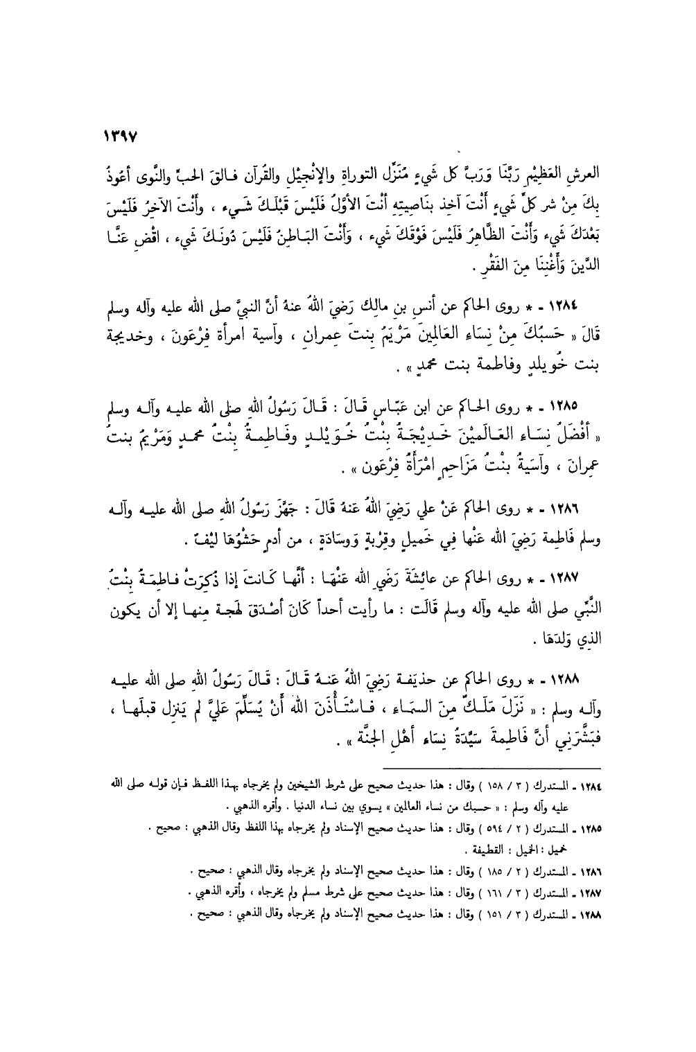 1284 - * روى الحاكم عن أنس بن مالك رضي الله عنه أن النبي صلى الله عليه وآله وسلم قال "حسبُك من نساء العالمين مريمُ بنت عمران، وآسية امرأة فرعون، وخديجة بنت خويلد وفاطمة بنت محمدٍ".
