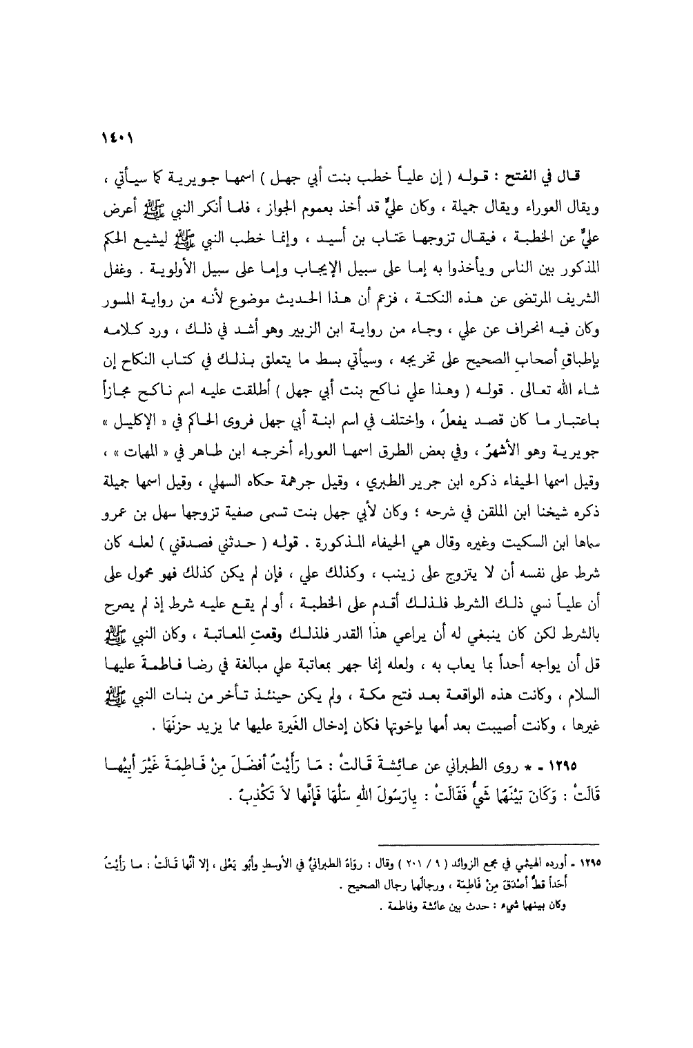 1295 - * روى الطبراني عن عائشة قالت: ما رأيتُ أفضل من فاطمة غير أبيها قالت: وكان بينهما شيء فقالت: يا رسول الله سلها فإنها لا تكذبُ (1).