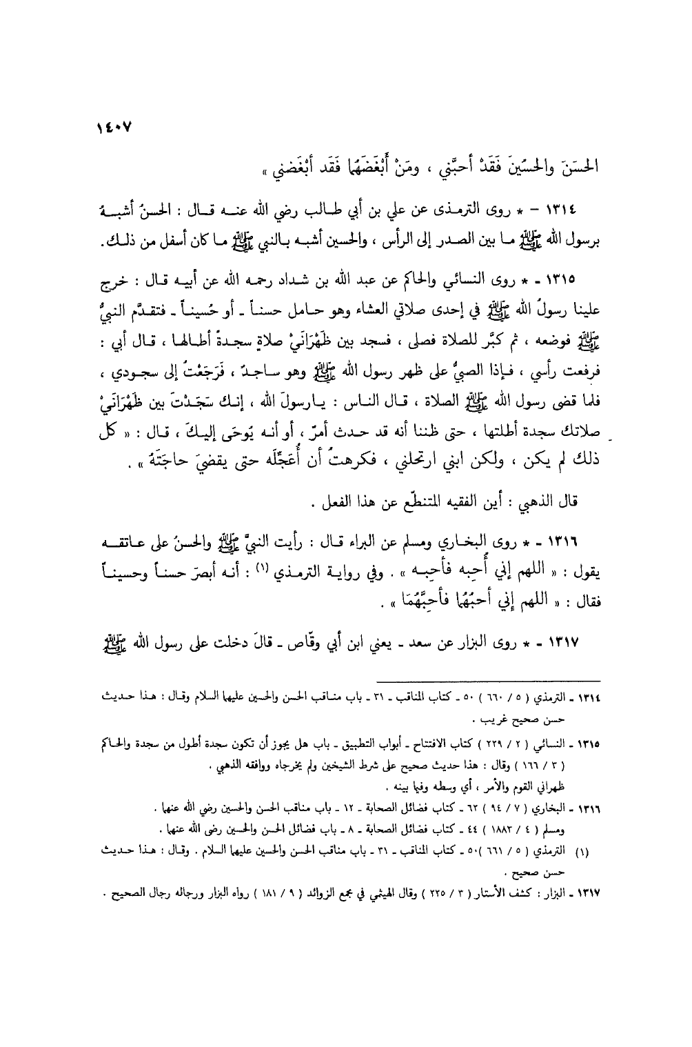 1316 - * روى البخاري ومسلم عن البراء قال: رأيت النبي صلى الله عليه وسلم والحسنُ على عاتقه يقول: "اللهم إني أحبه فأحبه". وفي رواية الترمذي (1): أنه أبصر حسناً وحسيناً فقال: "اللهم إني أحبهما فأحبهما".