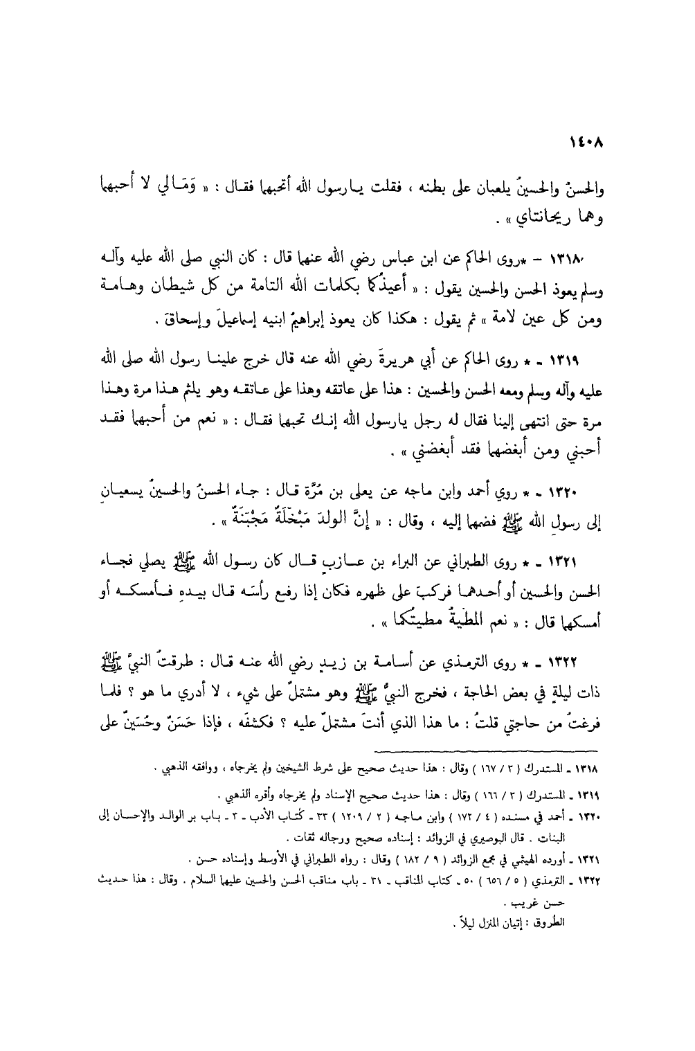 1319 - * روى الحاكم عن أبي هريرة رضي الله عنه قال خرج علينا رسول الله صلى الله عليه وآله وسلم ومعه الحسن والحسين: هذا على عاتقه وهذا على عاتقه وهو يلثم هذا مرة وهذا مرة حتى انتهى إلينا فقال له رجل يا رسول الله إنك تحبهما فقال: "نعم من أحبهما فقد أحبني ومن أبغضهما فقد أبغضني".