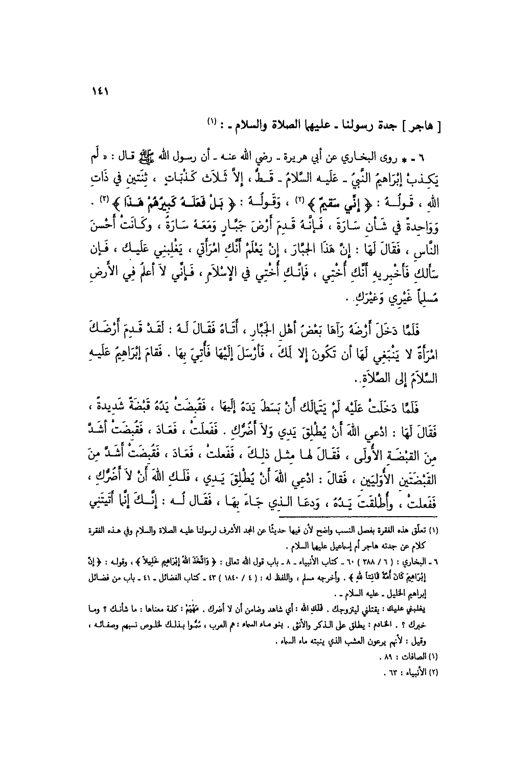 (1) تعلق هذه الفقرة بفصل النسب واضح لأن فيها حديثاً من المجد الأشرف لرسولنا عليه الصلاة والسلام وفي هذه الفقرة كلام عن جدته هاجر أم إسماعيل عليهما السلام.