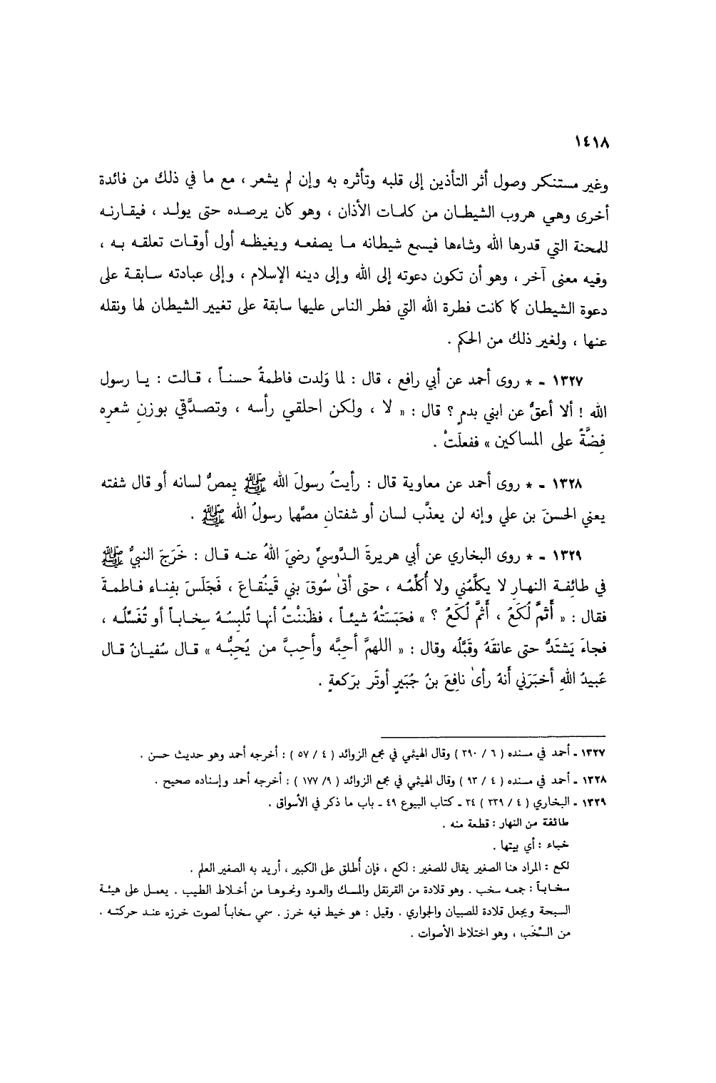 1329 - * روى البخاري عن أبي هريرة الدوسي رضي الله عنه قال: خرج النبي صلى الله عليه وسلم في طائفة النهار لا يكلمني ولا أكلمه، حتى أتى سوق بني قينقاع، فجلس بفناء فاطمة فقال: "أثم لكع، أثم لكعُ؟ " فحبسته شيئاً، فظننت أنها تُلبسه سخاباً أو تغسله، فجاء يشتد حتى عانقهُ وقبله قوال: طاللهم أحبه وأحب من يحبه" قال سفيان قال عبيد الله أخبرني أنه رأى نافع بن جبير أوتر بركعة (1).