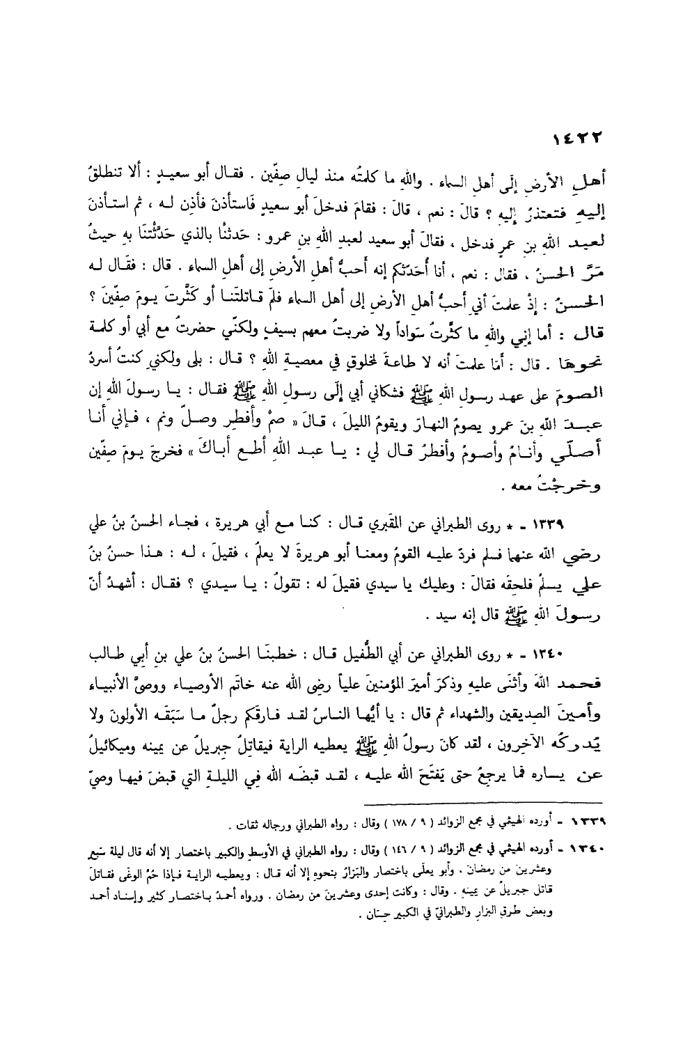 1339 - * روى الطبراني عن المقبري قال: كان مع أبي هريرة، فجاء الحسن بن علي رضي الله عنهما فسلم فرد عليه القوم ومعنا أبو هريرة لا يعلم، فقيل، له: هذا حسن بن علي يسلم فلحقه فقال: وعليك يا سييد فقيل له: تقول: يا سيدي؟ فقال: أشهد أن رسول الله صلى الله عليه وسلم قال إنه سيد.