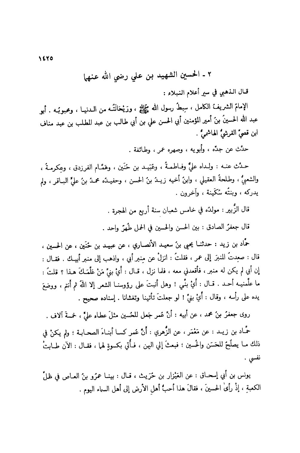 حماد بن زيد: حدثنا يحيى بن سعيد الأنصاري، عن عبيد بن حُنين، عن الحسين، قال: صعدتُ المنبر إلى عمر، فقلت: انزل عن منبر أبي، واذهب إلى منبر أبيك. فقال: إن أبي لم يكن له منبر، فأقعدني معه، فلما نزل، قال: أي بني من علمك هذا؟ قلت: ما علمنيه أحد. قال: أي بني! وهل أنبت على رؤوسنا الشعر إلا الله ثم أنتم، ووضع يده على رأسه، وقال: أي بني! لو جعلت تأتينا وتغشانا. إسناده صحيح.