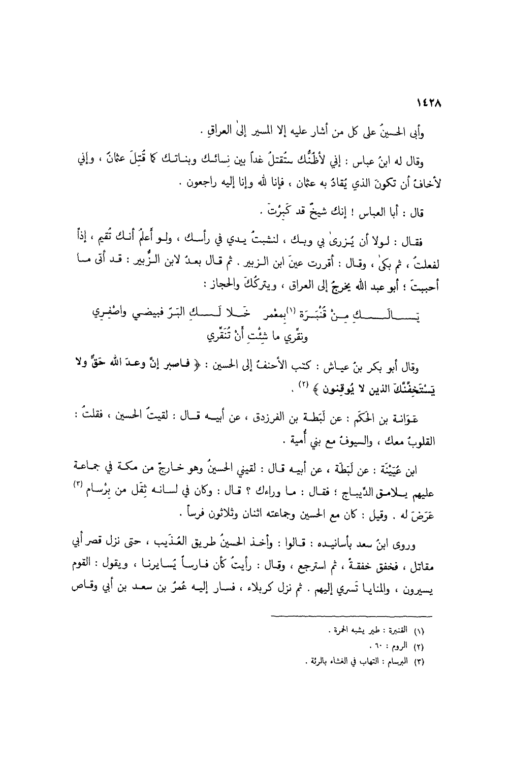 ابن عُيينة: عن لبطة، عن أبيه قال: لقيني الحسين وهو خارج من مكة في جماعة عليهم يلامق الديباج؛ فقال: ما وراءك؟ قال: وكان في لسانه ثِقل من برسام (3) عرض له. وقيل: كان مع الحسين وجماعته اثنان وثلاثون فرساً.