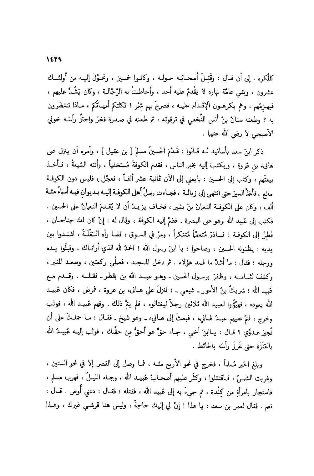ذكر ابن سعد بأسانيد له قالوا: قدم الحسين مسلم [بن عقيل]، وأمره أن ينزل على هانئ بن عروة، ويكتب إليه بخبر الناس، فقدم الكوفة مُستخفياً، وأتته الشيعة، فأخذ بيعتهم، وكتب إلى الحسين: بايعني إلى الآن ثمانية عشر ألفاً، فعجَّل؛ فليس دون الكوفة مانع، فأغذ السير حتى انتهى إلى زبالة، فجاءت رسل أهل الكوفة إليه بديوان فيه أسماء مئة ألف، وكان على الكوفة النعمان بن بشير، فخاف يزيد أن لا يقدم النعمان على الحسين. فكتب إلى بعيد الله وهو على البصرة. فضم إليه الكوفة، وقال له: إن كان لك جناحان، فطرْ إلى الكوفة! فبادر متعمماً متنكراً، ومر في السوق، لما رآه السفلة، اشتدوا بين يديه: يظنونه الحسين، وصاحوا: يا ابن رسول الله! الحمد لله الذي أراناك، وقبلوا يده ورجله؛ فقال: ما أشد ما فسد هؤلاء. ثم دخل المسجد، فصلى ركعتين، وصعد المنبر، وكشف لثامهم، وظفر برسول الحسين - وهو عبد الله بن بقطر - فقتله. وقدم مع عبيد الله؛ شريك بن الأعور - شيعي-؛ فنزل على هانئ بن عروة، فمرض، فكان عبيد الله يعوده، فهيؤوا لعبيد الله ثلاثين رجلاً ليغتالوه، فلم يتم ذلك. وفهم عُبيد الله، فوثب وخرج، فنم عليهم عبدُ لهانئ، فبعث إلى هانئ - وهو شيخ - فقال: ما حملك على أن تُجيز عدوي؟ قال: يا ابن أخي، جاء حق هو أحقُّ من حقك، فوثب إليه عبيد الله بالعنزة حتى غرز رأسه بالحائط.
