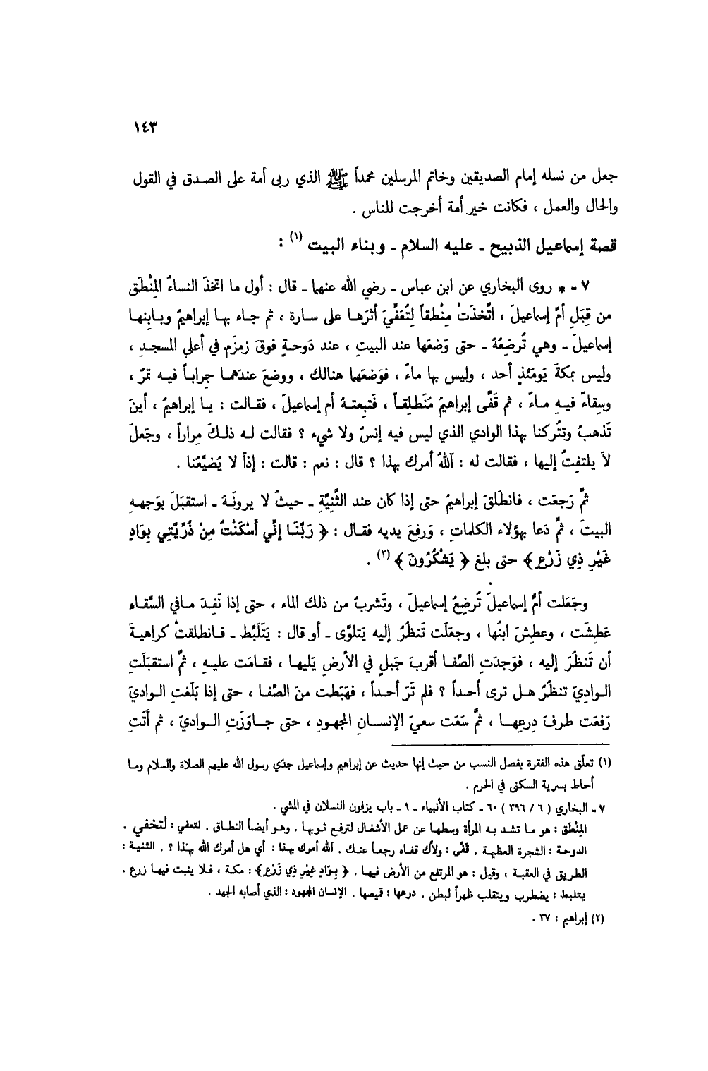 (1) تعلق هذه الفقرة بفصل النسب من حيث إنها حديث عن إبراهيم وإسماعيل جدي رسول الله عليهم الصلاة والسلام وما أحاط بسرية السكنى في الحرم.