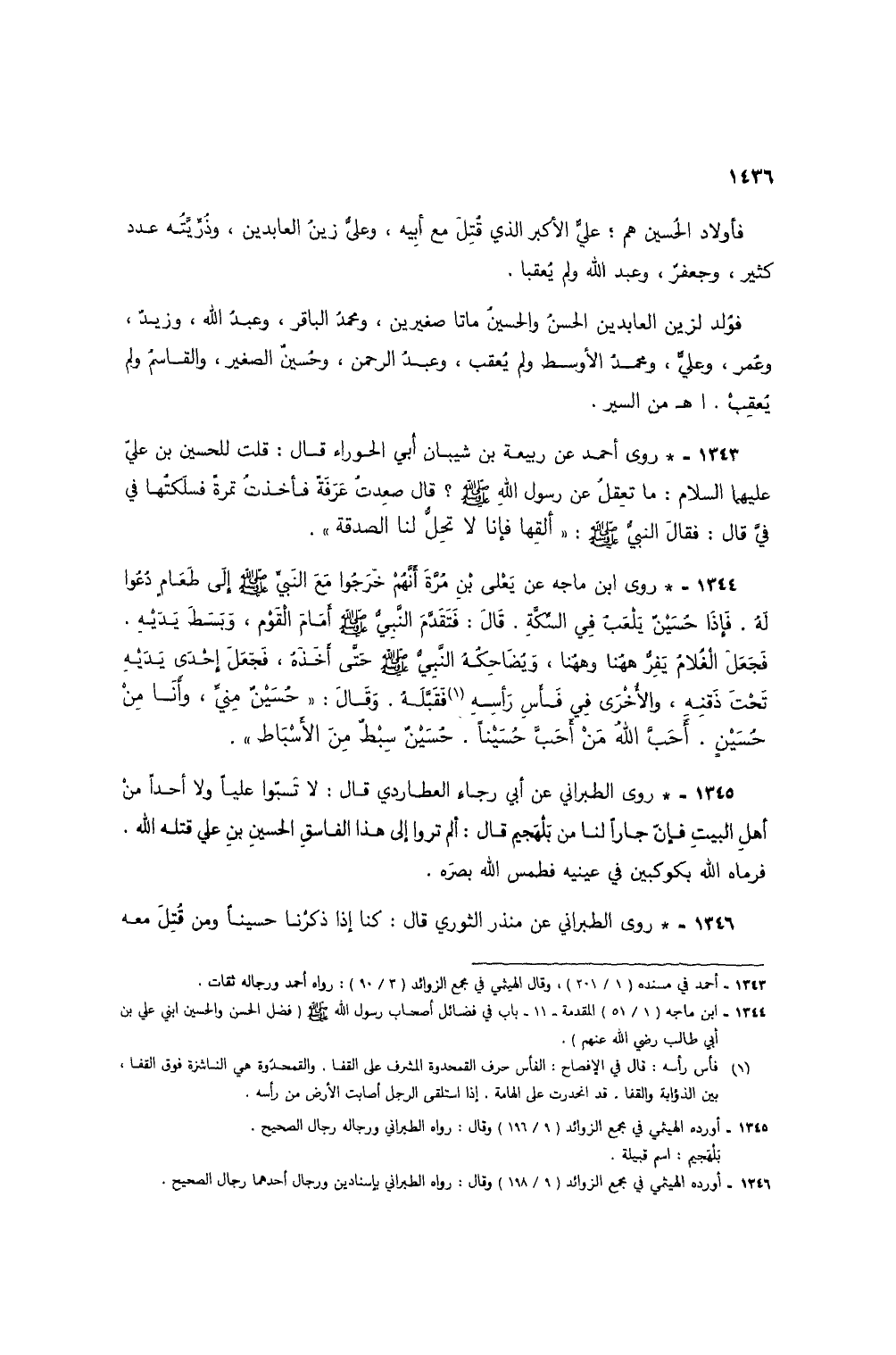 1345 - * روى الطبراني عن أبي رجاء العطاردي قال: لا تسبوا علياً ولا أحداً من أهل البيت فإن جاراً لنا من بلهجيم قال: ألم تروا إلى هذا الفاسق الحسين بن علي قتله الله. فرماه الله بكوكبين في عينيه فطمس الله بصره.