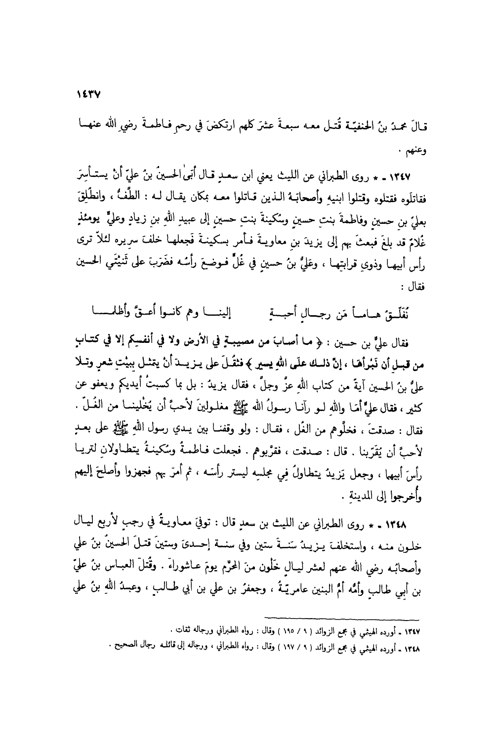 1347 - * روى الطبراني عن الليث يعني ابن سعد قال أبي الحسين بن علي أن يستأسر فقاتلوه فقتلوه وقتلوا ابنيه وأصحابه الذين قاتلوا معه بمكان يقال له: الطَّفُّ، وانطلق بعلي بن حسين وفاطمة بنت حسين وسكينة بنت حسين إلى عبيد الله بن زياد وعليٍّ يومئذٍ غلام قد بلغ فبعث بهم إلى يزيد بن معاوية فأمر بسكينة فعجلها خلف سريره لئلا ترى رأس أبيها وذوي قرابتها، وعليُّ بن حسينٍ في غُلٍّ فوضع رأسه فضرب على ثنيتي الحسين فقال: