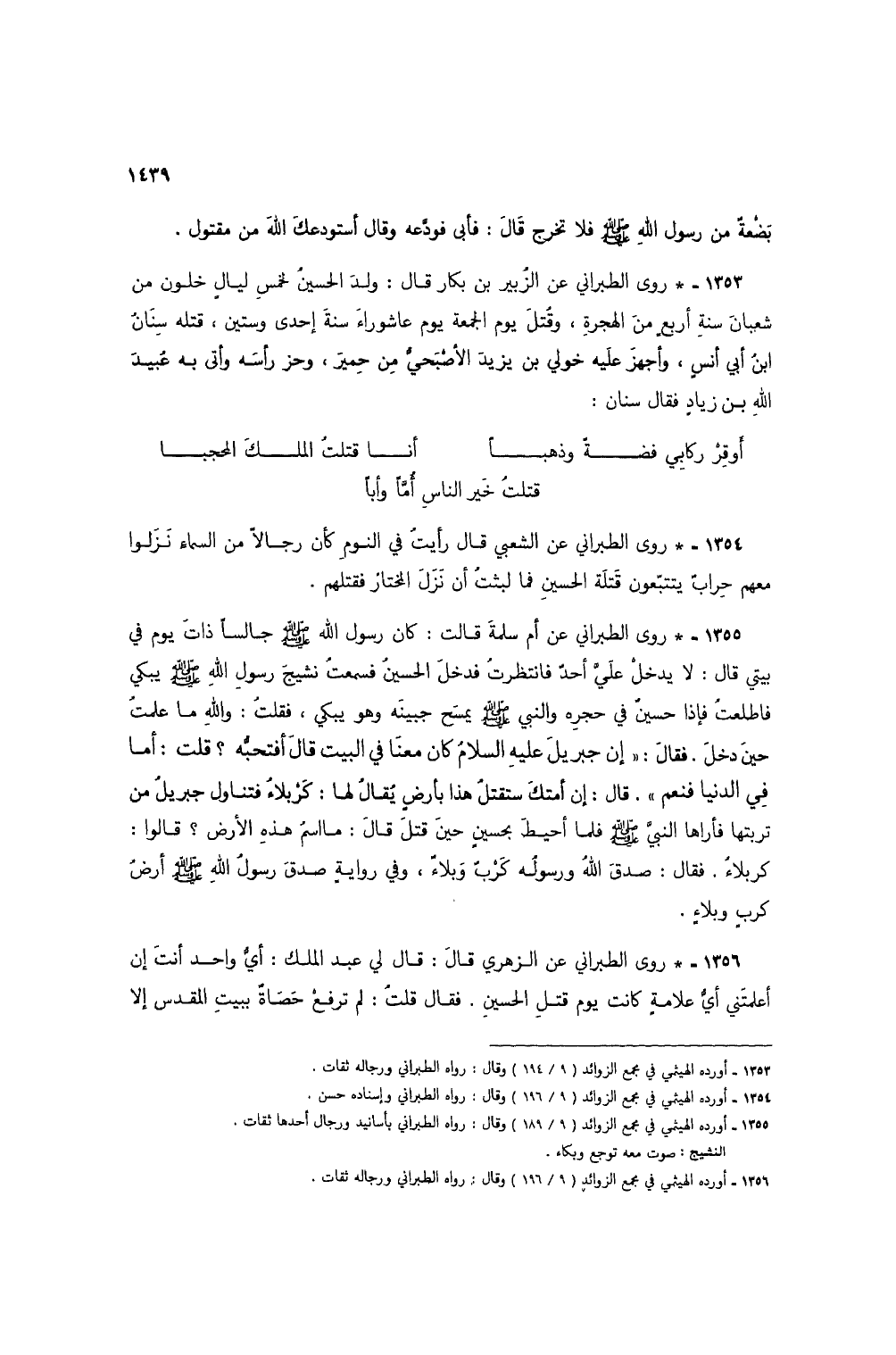 1353 - * روى الطبراني عن الزبير بن بكار قال: ولد الحسينُ لخمس ليال خلون من شعبان سنة أربع من الهجرة، وقُتل يوم الجمعة يوم عاشوراء سنة إحدى وستين، قتله سنان ابن أبي أنس، وأجهز عليه خولي بن يزيد الأصبحي من حمير، وحز رأسه وأتى به عبيد الله بن زياد فقال سنان: