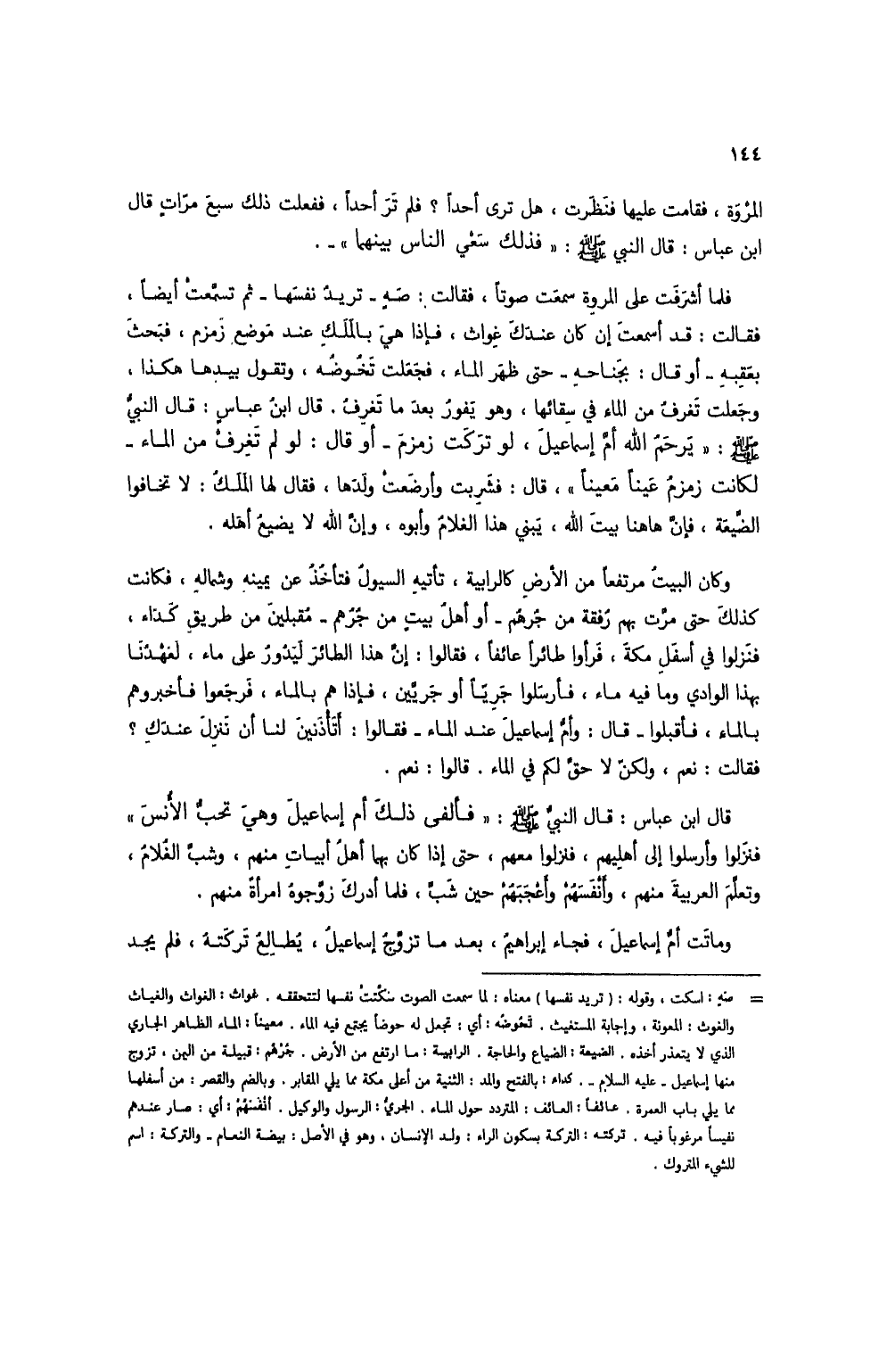 = صهِ: نسكت، وقوله: (تريد نفسها) معناه: لما سمعت الصوت سكتت نفسها لتتحققه. غواث: الغواث والغياث والغوث: المعونة، وإجابة المستغيث. تحوضه: أي: تجعل له حوضاً يجتمع فيه الماء. معيناً: الماء الظاهر الجاري الذي لا يتعذر أخذه. الضيعة: الضياع والحاجة. الرابية: ما ارتفع من الأرض. جَرْهُم: قبيلة من اليمن، تزوج منه إسماعيل - عليه السلام -، كفاء: بالفتح والمد: الثنية من أعلى مكة مما يلي المقابر. وبالضم والقصر: من أسفلها مما يلي باب العمرة. عائفاً: العائف: المتردد حول الماء. الجري: الرسول والوكيل. أنفسهم: أي: صار عندهم نفيساً مرغوباً فيه. تركته: التركة بسكون الراء: ولد الإنسان، وهو في الأصل: بيضة النعام - والتركة: اسم للشيء المتروك.