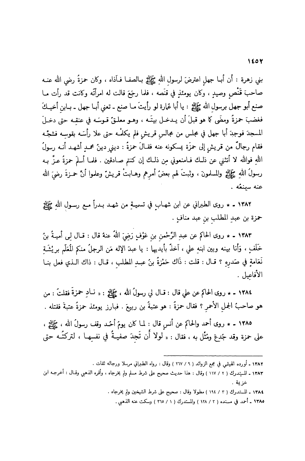 1382 - * روى الطبراني عن ابن شهابٍ في تسميةِ من شهد بدراً مع رسول الله صلى الله عليه وسلم حمزة بن عبد المطلب بن عبد منافٍ.