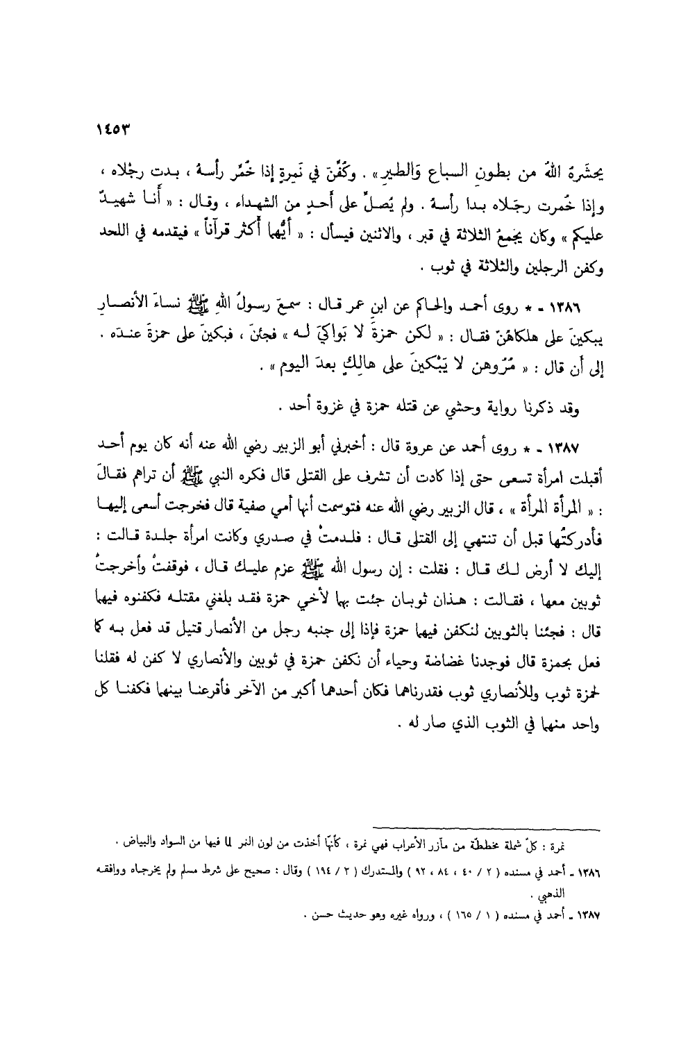 1387 - * روى أحمد عن عروة قال: أخبرني أبو الزبير رضي الله عنه أنه كان يوم أحد أقبلت امرأة تسعى حتى إذا كادت أن تشرف على القتلى قال فكره النبي صلى الله عليه وسلم أن تراهم فقال: "المرأة المرأة"، قال الزبير رضي الله عنه فتوسمت أنها أمي صفية قال فخرجت أسعى إلأيه فأدركتُها قبل أن تنتهي إلى القتلى قال: فلدمتْ في صدري وكانت امرأة جلدة قالت: إليك لا أرض لك قال: فقلت: إن رسول الله صلى الله عليه وسلم عزم عليك قال، فوقفتُ وأخرجتُ ثوبين معها، فقالت: هذان ثوبان جئت بهما لأخي حمزة فقد بلغني مقتله فكفنوه فيهما قال: فجئنا بالثوبين لنكفن فيهما حمزة فإذا إلى جنبه رجل من الأنصار قتيل قد فعل به كما فعل بحمزة قال فوجدنا غضاضة وحياء أن نكفن حمزة في ثوبين والأنصاري لا كفن له فقلنا لحمزة ثوب وللأنصاري ثوب فقدرناهما فكان أحدهما أكبر من الآخر فأقرعنا بينهما فكفنا كل واحد منهما في الثوب الذي صار له.