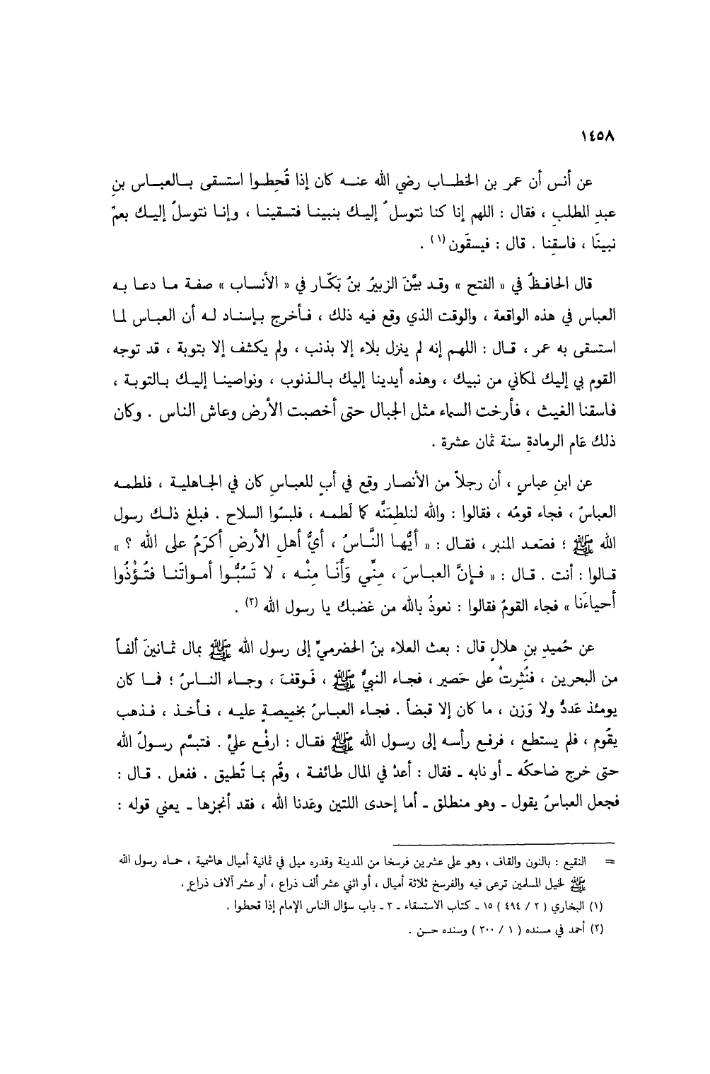 عن أنس أن عمر بن الخطاب رضي الله عنه كان إذا قُحِطوا استسقى بالعباس بن عبد المطلب، فقال: اللهم إنا كنا نتوسلُ إليك بنبينا فتسقينا، وإنا نتوسل إليك بعم نبينا، فاسقنا. قال: فيسقون (1).