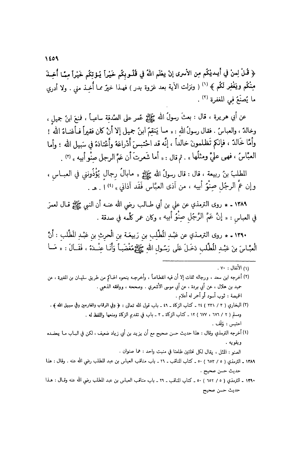 عن أبي هريرة، قال: بعث رسول الله صلى الله عليه وسلم عُمر على الصدقة ساعياً، فمنع ابنُ جميلٍ، وخالدٌ، والعباسُ. فقال رسول الله: "ما ينقمُ ابن جميل إلا أن كان فقيراً فأغناه الله! وأما خالد، فإنكم تظلمون خالداً، إنه قد احتبس أدراعه وأعتادهُ في سبيل الله؛ وأما العباس، فهي عليَّ ومثلها". ثم قال: "أما شعرت أن عم الرجل صِنْو أبيه" (3).