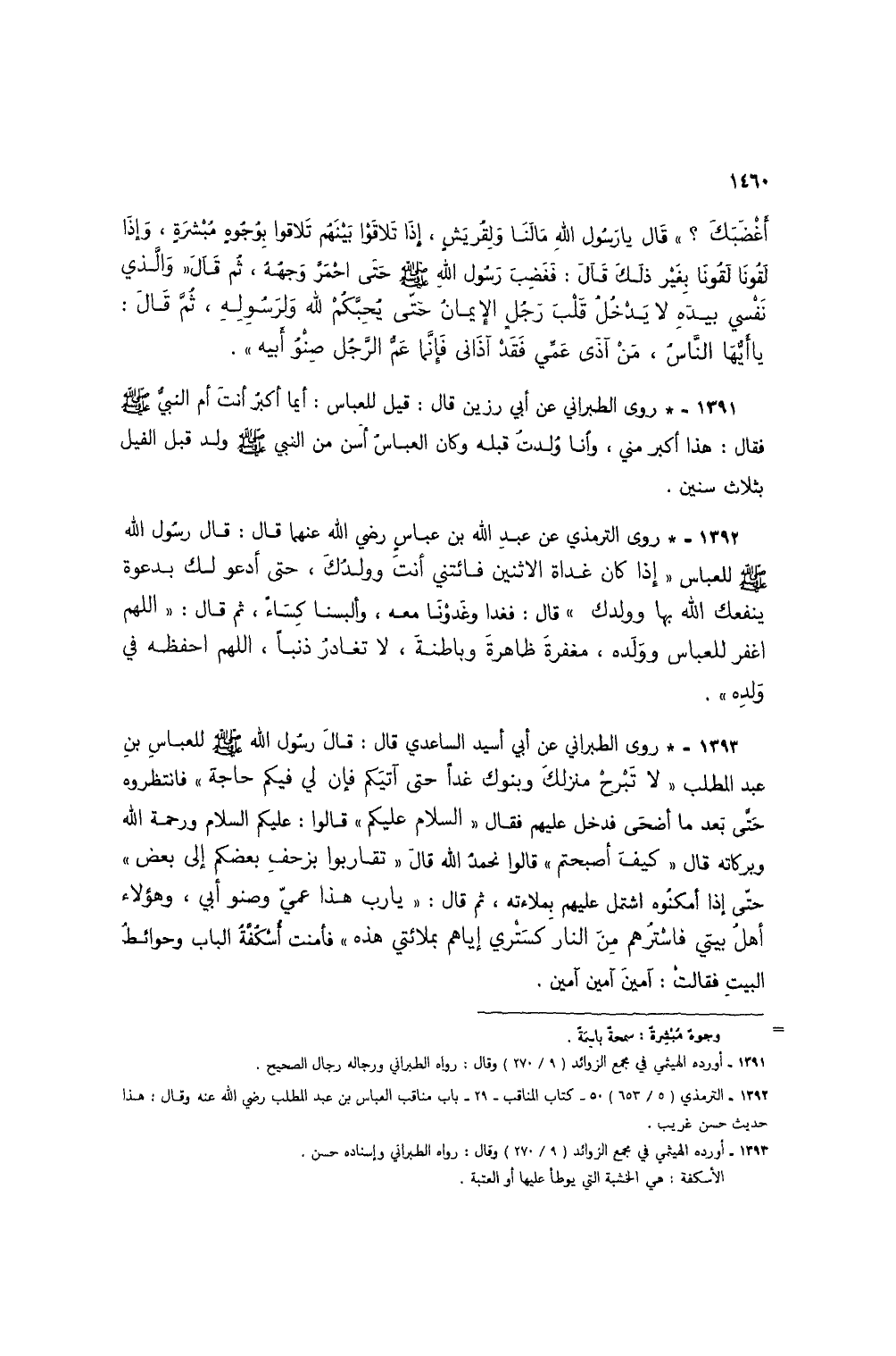 1393 - * روى الطبراني عن أبي أٍيد الساعدي قال: قال رسول الله صلى الله عليه وسلم للعباس بن عبد المطلب "لا تبرحْ منزل وبنوك غداً حتى آتيكم فإن لي فيكم حاجة" فانتظروه حتى بعد ما أضحى فدخل عليهم فقال "السلام عليكم" قالوا: عليكم السلام ورحمة الله وبركاته قال "كيف أصبحتم" قالوا نحمدُ الله قال "تقاربوا بزحف بعضكم إلى بعض" حتى إذا أمكنوه اشتمل عليهم بملاءته، ثم قال: "يارب هذا عمي وصنو أبي، وهؤلاء أهل بيتي فاسترهم من النار كستري إياهم بملائتي هذه" فأمنت أسكُفةَ الباب وحوائطُ البيت فقالت: آمين آمين آمين (1).