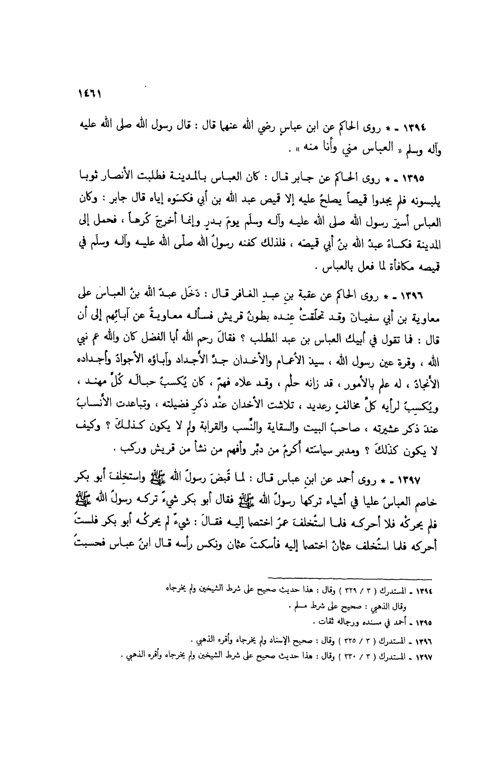 1396 - * روى الحاكم عن عقبة بن عبد الغافر اقل: دخل عبد الله بن العباس على معاوية بن أبي سفيان وقد تحلقت عنده بطون قريش فسأله معاوية عن آبائهم إلى أن قال: فما تقول في أبيك العباس بن عبد المطلب؟ فقال رحم الله أبا الفضل كان والله عم نبي الله، وقرة عين رسول الله، سيد الأعمام والأخدان جد الأجداد وآباؤه الأجوادُ وأجداده الأنجادُ، له علم بالأمور، قد زانه حلم، وقد علاه فهمٌ، كان يُكسبُ حباله كل مهند، ويُكسبُ لرأيه كل مخالفٍ رعديد، تلاشت الأخدان عند ذكر فضيلته، وتباعدت الأنسابُ عند ذكر عشيرته، صاحبُ البيت والسقاية والنسب والقرابة ولم لا يكون كذلك؟ وكيف لا يكون كذلك؟ ومدبر سياسته أكرمُ من دبر وأفهم من نشأ من قريش وركب.