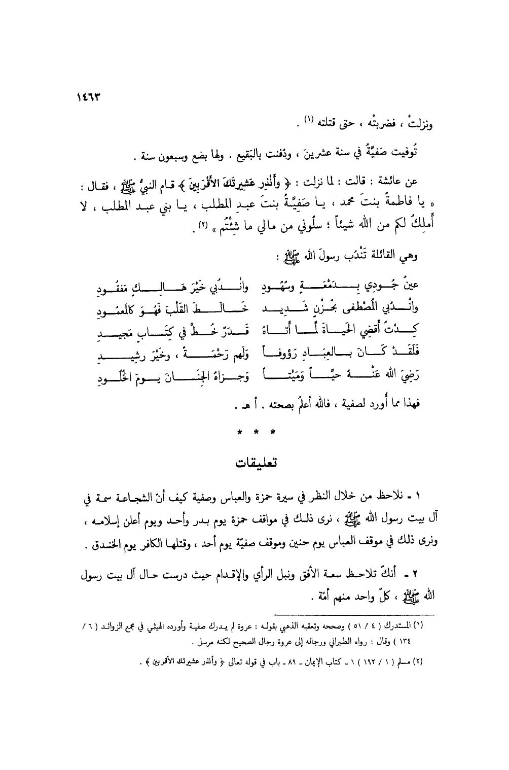 (1) المستدرك (4/ 51) وصححه ونعقبه الذهبي بقوله: عروة لم يدرك صفية وأورده الهيثمي في مجمع الزوائد (6/ 134) وقال: رواه الطبراني ورجاله إلى عروة رجال الصحيح لكنه مرسل.