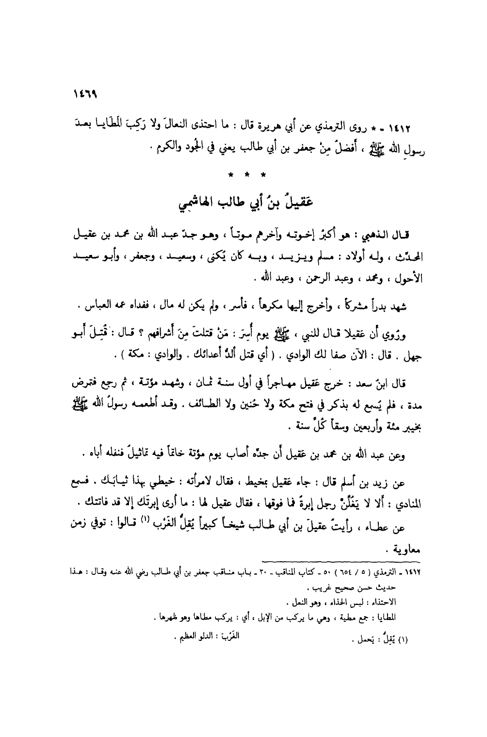 1412 - * روى الترمذي عن أبي هريرة قال: ما احتذى النعال ولا ركب المطايا بعد رسول الله صلى الله عليه وسلم، أفضل من جعفر بن أبي طالب يعني في الجُود والكرم.