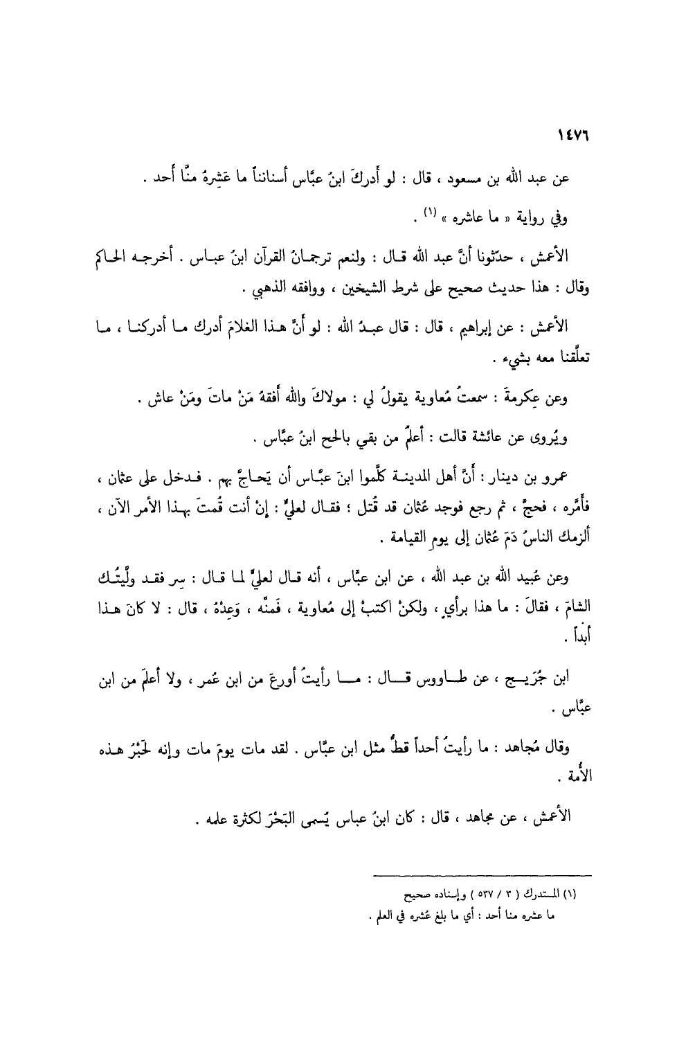 الأعمش: حدثونا أن عبد الله قال: ولنعم ترجمانُ القرآن ابن عباس. أخرجه الحاكم وقال: هذا حديث صحيح على شرط الشيخين، ووافقه الذهبي.