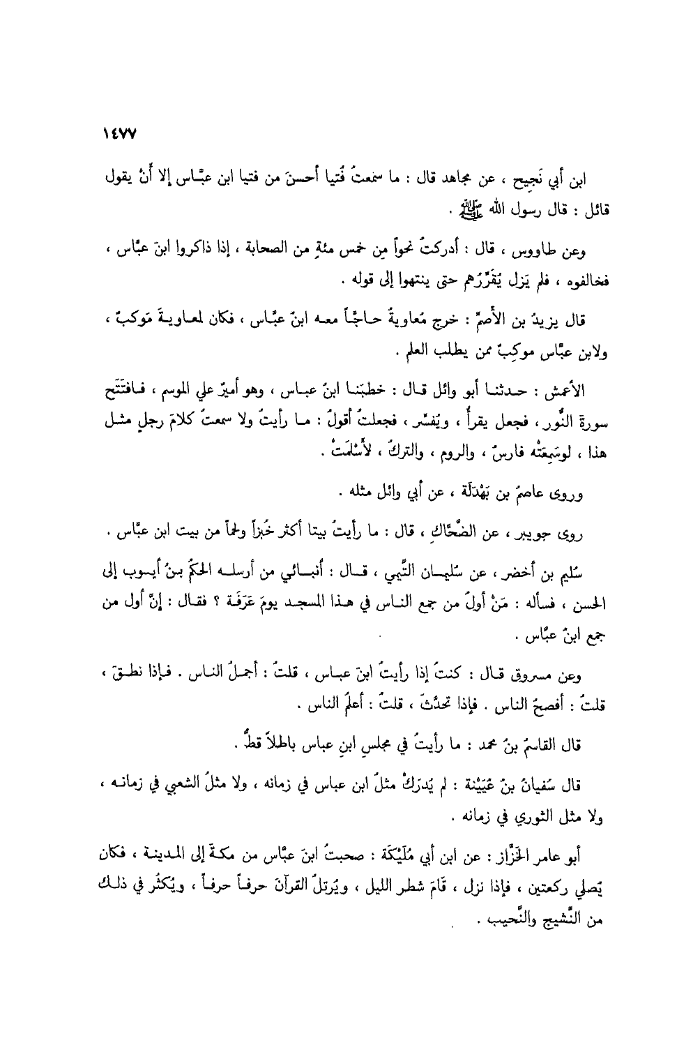 ابن أبي نجيح، عن مجاهد قال: ما سمعتُ فُتيا أحسنَ من فتيا ابن عباس إلا أن يقول قائل: قال رسول الله صلى الله عيه وسلم.