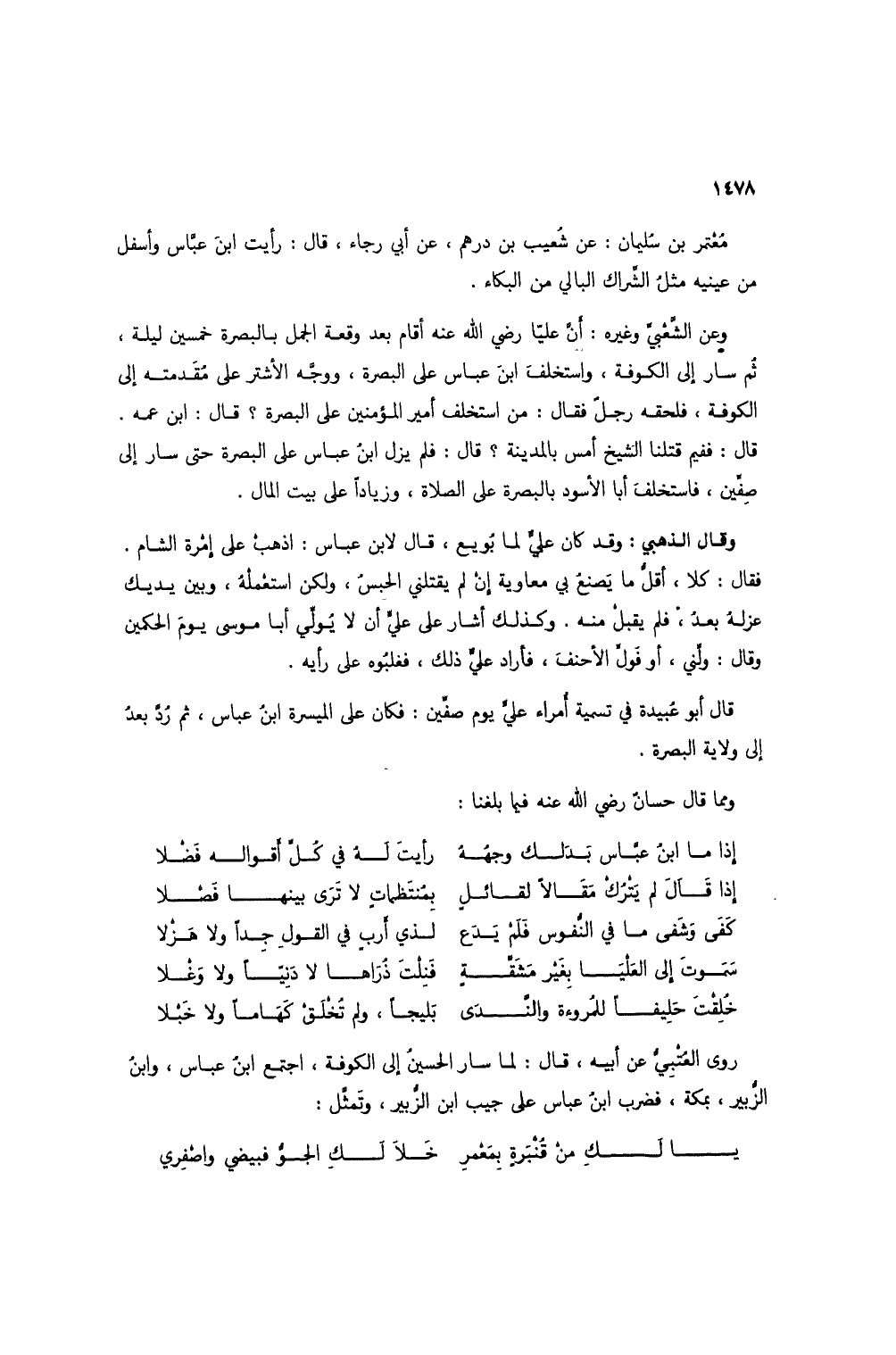 وعن الشعبي وغيره: أن علياً رضي الله عنه أقام بعد وقعة الجمل بالبصرة خمسين ليلة، ثم سار إلى الكوفة، واستخلف ابن عباس على البصرة، ووجه الأشتر على مُقدمته إلى الكوفة، فلحقه رجل فقال: من استخلف أمير المؤمنين على البصرة؟ قال: ابن عمه. قال: ففيم قتلنا الشيخ أمس بالمدينة؟ قال: فلم يزل ابن عباس على البصرة حتى سار إلى صفين، فاستخلف أبا الأسود بالبصرة على الصلاة، وزياداً على بيت المال.