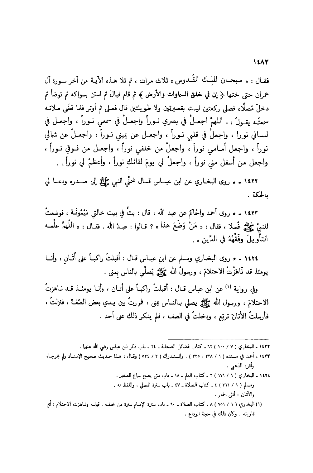 1422 - * روى البخاي عن ابن عباس قال ضمني النبي صلى الله عليه وسلم إلى صدره ودعا لي بالحكمة.