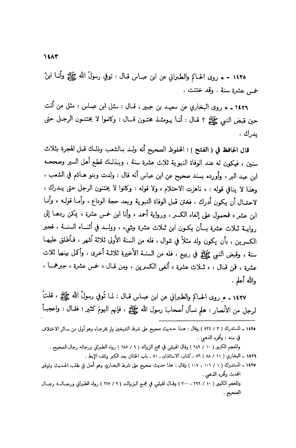 1425 - * روى الحاكم والطبراني عن ابن عباس قال: توفي رسول الله صلى الله عليه وسلم وأنا ابن خمس عشرة سنة. وقد ختنت.