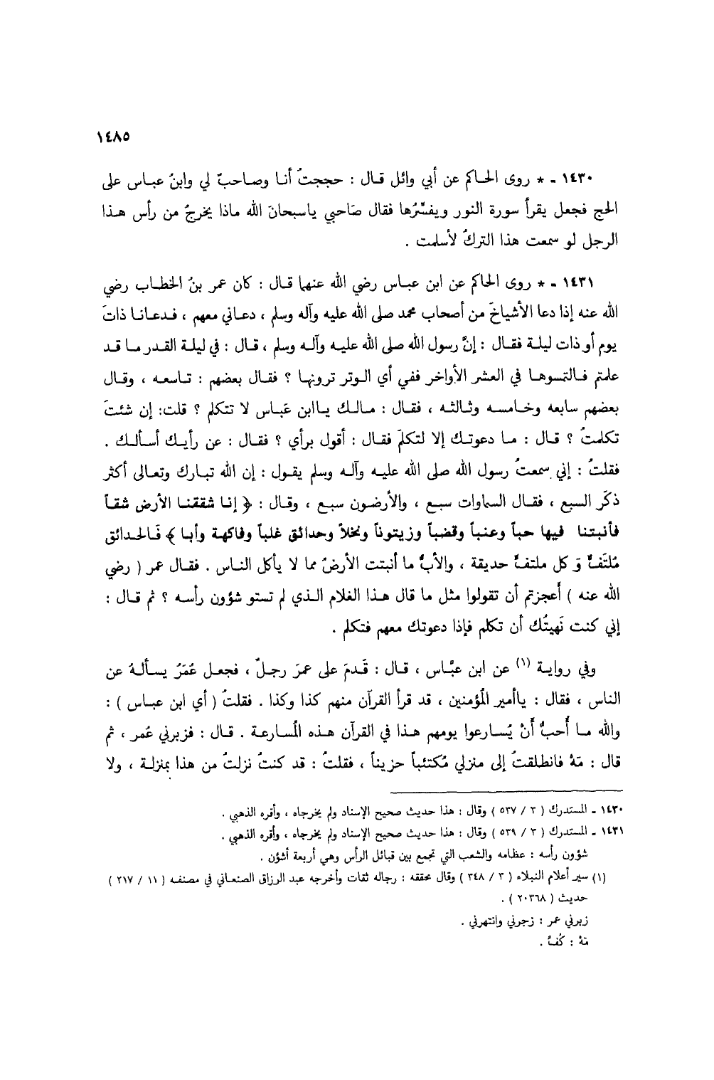 1431 - * روى الحاكم عن ابن عباس رضي الله عنهما قال: كان عمر بن الخطاب رضي الله عنه إذا دعا الأشياخ من أصحاب محمد صلى الله عليه وآله وسلم، دعاني معهم، فدعانا ذات يوم أو ذات ليلة فقال: إن رسول الله صلى الله عليه وآله وسلم، قال: في ليلة القدر ما قد علمتم فالتمسوها في العشر الأواخر ففي أي الوتر ترونها؟ فقال بعضهم: تاسعه، وقال بعضهم سابعه وخامسه وثالثه، فقال: مالك يا ابن عباس لا تتكلم؟ قلت: إن شئت تكلمتُ؟ قال: ما دعوتك إلا لتكلم فقال: أقول برأي؟ فقال: عن رأيك أسألك. فقلتُ: إني سمعتُ رسول الله صلى الله عليه وآله وسلم يقول: إن الله تبارك وتعالى أكثر ذكر السبع، فقال السماوات سبع، والأرضون سبع، وقال: {ثُمَّ شَقَقْنَا الْأَرْضَ شَقًّا فَأَنْبَتْنَا فِيهَا حَبًّا وَعِنَبًا وَقَضْبًا وَزَيْتُونًا وَنَخْلًا وَحَدَائِقَ غُلْبًا وَفَاكِهَةً وَأَبًّا} فالحدائق مُلتفٌّ وكل ملتفٌّ حديقة، والأب ما أنبتت الأرض مما لا يأكل الناس. فقال عمر (رضي الله عنه) أعجزتم أن تقولوا مثل ما قال هذا الغلام الذي لم تستو شؤون رأسه؟ ثم قال: إني كنت نهيتُك أن تكلم فإذا دعوتك معهم فتكلم.