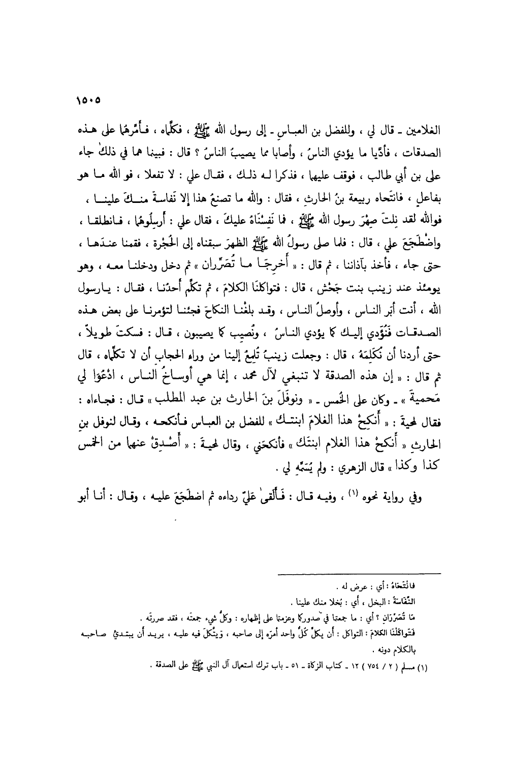 الغلامين - قال لي، وللفضل بن العباس - إلى رسول الله صلى الله عليه وسلم، فكلماه، فأمرهما على هذه الصدقات، فأديا ما يؤدي الناسُ، وأصابا مما يصيبُ الناسُ؟ قال: فبينما هما في ذلك جاء علي بن أبي طالب، فوقف عليهما، فذكرا له ذلك، فقال علي: لا تفعلا، فوالله ما هو بفاعلٍ، فانتحاه ربيعة بن الحارث، فقال: والله ما تصنعُ هذا إلا نفاسة منك علينا، فوالله لقد نلت صِهْرَ رسول الله صلى الله عليه وسلم، فما نفسناهُ عليك، فقال علي: أرسلُوهُما، فانطلقا، واضطجع علي، قال: فلما صلى رسول الله صلى الله عليه وسلم الظهر سبقناه إلى الحُجرة، فقمنا عندها، حتى جاء، فأخذ بآذاننا، ثم قال: "أَخرجَا ما تُصرِّران" ثم دخل ودخلنا معه، وهو يومئذ عند زينب بنت جحش، قال: فتواكلنا الكلام، ثم تكلم أحدُنا، فقال: يا رسول الله، أنت أبر الناس، وأوصلُ الناس، وقد بلغنا النكاح فجئنا لتؤمرنا على بعض هذه الصدقات فنؤدي إليك كما يؤدي الناسُ، ونُصيب كما يصيبون، قال: فسكت طويلاً، حتى أردنا أن نُكلمهُ، قال: جعلت زينبُ تُلمِعُ إلينا من وراء الحجاب أن لا تكلماه، قال ثم قال: "إن هذه الصدقة لا تنبغي لآل محمد، إنما هي أوساخُ الناس، ادعُوا لي محميةَ"- وكان على الخُمس- "ونوفل بن الحارث بن عبد المطلب" قال: فجاءاه: فقال لمحية: "أنكِحْ هذا الغلام ابنتك" للفضل بن العباس فأنكحه، وقال لنوفل بن الحارث "أنكحْ هذا الغلام ابنتك" فأنكحني، وقال لمحيةَ: "أصدِقْ عنهما من الخمس كذا وكذا" قال الزهري: ولم يُسَمِّهِ لي.