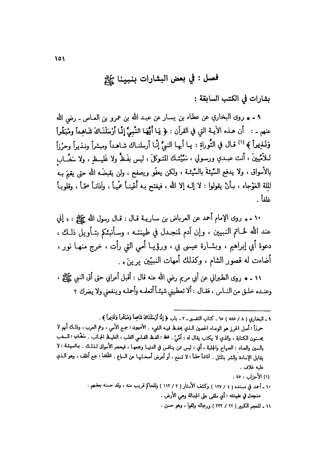 9 - * روى البخاري عن عطاء بن يسار عن عبد الله بن عمرو بن العاص - رضي الله عنهم -: أن هذه الآية التي في القرآن: {يَاأَيُّهَا النَّبِيُّ إِنَّا أَرْسَلْنَاكَ شَاهِدًا وَمُبَشِّرًا وَنَذِيرًا} (1). قال في التوراة: يا أيها النبي إنا أرسلناك شاهداً ومبشراً ونذيراً وحرزاً للأميين، أنت عبدي ورسولي، سميتُك المتوكل، ليس بفظ ولا غليظ، ولا سخابٍ بالأسواق، ولا يدفع السيئة بالسيئة، ولكن يعف ويصفح، ولن يقبضه الله حتى يقيم به الملة العوجاء، بأن يقولوا: لا إله إلا الله، فيفتح به أعيناً عمياً، وآذاناً صماً، وقلوباً غلفاً.