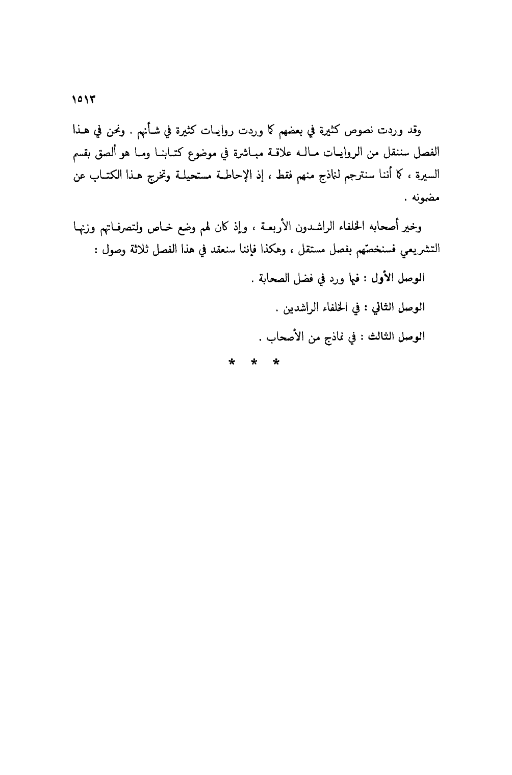 وخير أصحابه الخلفاء الراشدون الأربعة، وإذ كان لهم وضع خاص ولتصرفاتهم وزنها التشريعي فسنخصهم بفصل مستقل، وهكذا فإننا سنعقد في هذا الفصل ثلاثة وصول: