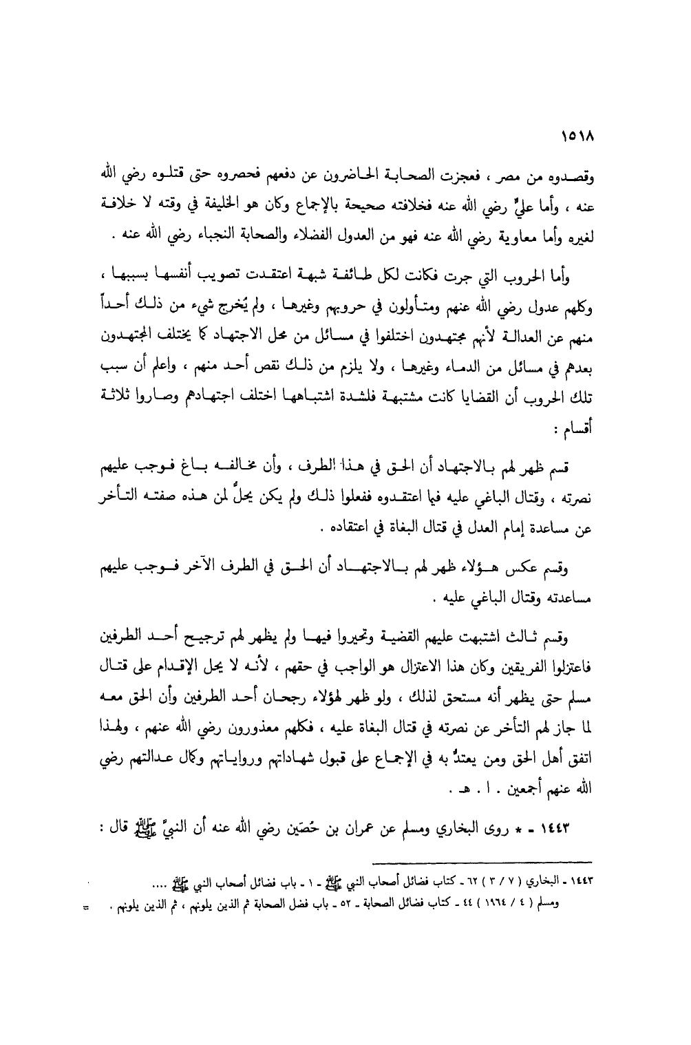 وأما الحروب التي جرت فكانت لكل طائفة شبهة اعتقدت تصويب أنفسها بسببها، وكلهم عدول رضي الله عنهم ومتأولون في حروبهم وغيرها، ولم يُخرج شيء من ذلك أحداً منهم عن العدالة لأنهم مجتهدون اختلفوا في مسائل من محل الاجتهاد كما يختلف المجتهدون بعدهم في مسائل من الدماء وغيرها، ولا يلزم من ذلك نقص أحد منهم، واعلم أن سبب تلك الحروب أن القضايا كانت مشتبهة فلشدة اشتباهها اختلف اجتهادهم وصاروا ثلاثة أقسام: