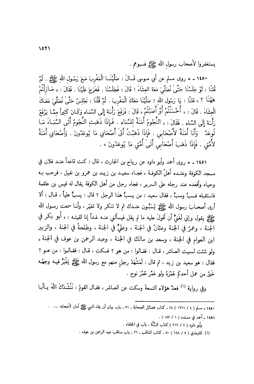1450 - * روى مسلم عن أبي موسى قال: صلينا المغرب مع رسول الله صلى الله عليه وسلم. ثم قُلنا: لو جلسنا حتى نُصلي معه العشاء! قال: فجلسنا. فخرج علينا. فقال: "ما زلتُمْ ههنا؟ " قلنا: يا رسول الله! صلينا معك المغرب. ثم قلنا: نجلسُ حتى نصلي معك العشاء. قال: "أحسنتُمْ أو أصبتُمْ" قال: فرفع رأسهُ إلى السماء وكان كثيراً مما يرفعُ رأسه إلى السماء. فقال: "النجُومُ أمنةٌ للسماء. فإذا ذهبت النجوم أتى السماء ما تُوعَدُ وأنا أمنةٌ لأصحابي. فإذا ذهبتُ أتى أصحابي ما يُوعدون. وأصحابي أمنةٌ لأمتي. فإذا ذهب أصحابي أتى أمتي ما يُوعدون".