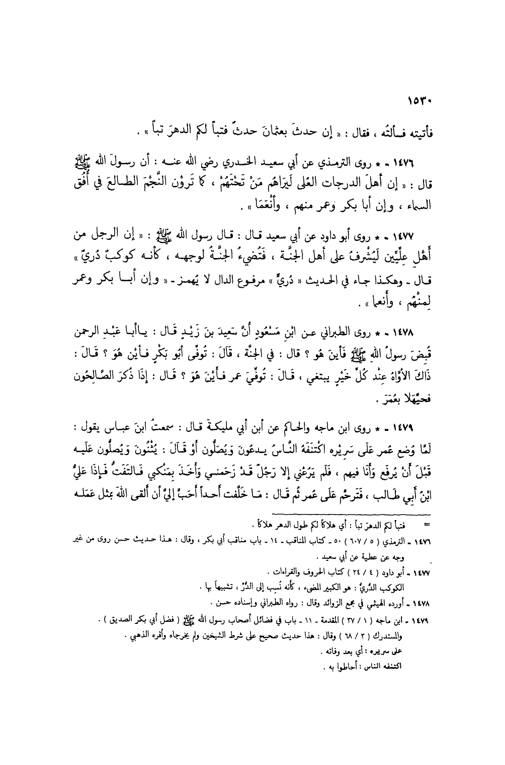 1476 - * روى الترمذي عن أبي سعيد الخدري رضي الله عنه: أن رسول الله صلى الله عليه وسلم قال: "إن أله الدرجات العُلى ليراهُم من تحتهم، كما ترون النجم الطالع في أفق السماء، وإن أبا بكر وعمر منهم، وأنعما".