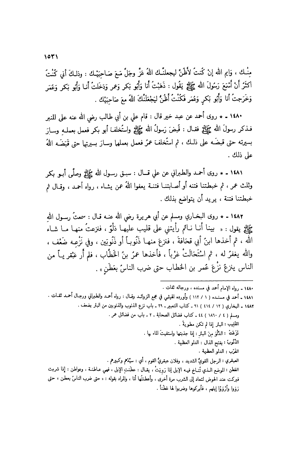 1482 - * روى البخاري ومسلم عن أبي هريرة رضي الله عنه قال: سمعتُ رسول الله صلى الله عليه وسلم يقول: "بينا أنا نائم رأيتني على قليب عليها دلوٌ، فنزعتُ منها ما شاء الله، ثم أخذها ابن أبي قحافة، فنزع منها ذنُوباً أو ذَنُوبين، وفي نزعِه ضعف، والله يغفر له، ثم استحالتْ غرباً، فأخذها عمر بن الخطاب، فلم أر عبقرياً من الناس ينزعُ نزع عمر بن الخطاب حتى ضرب الناسُ بعطنٍ" (1).