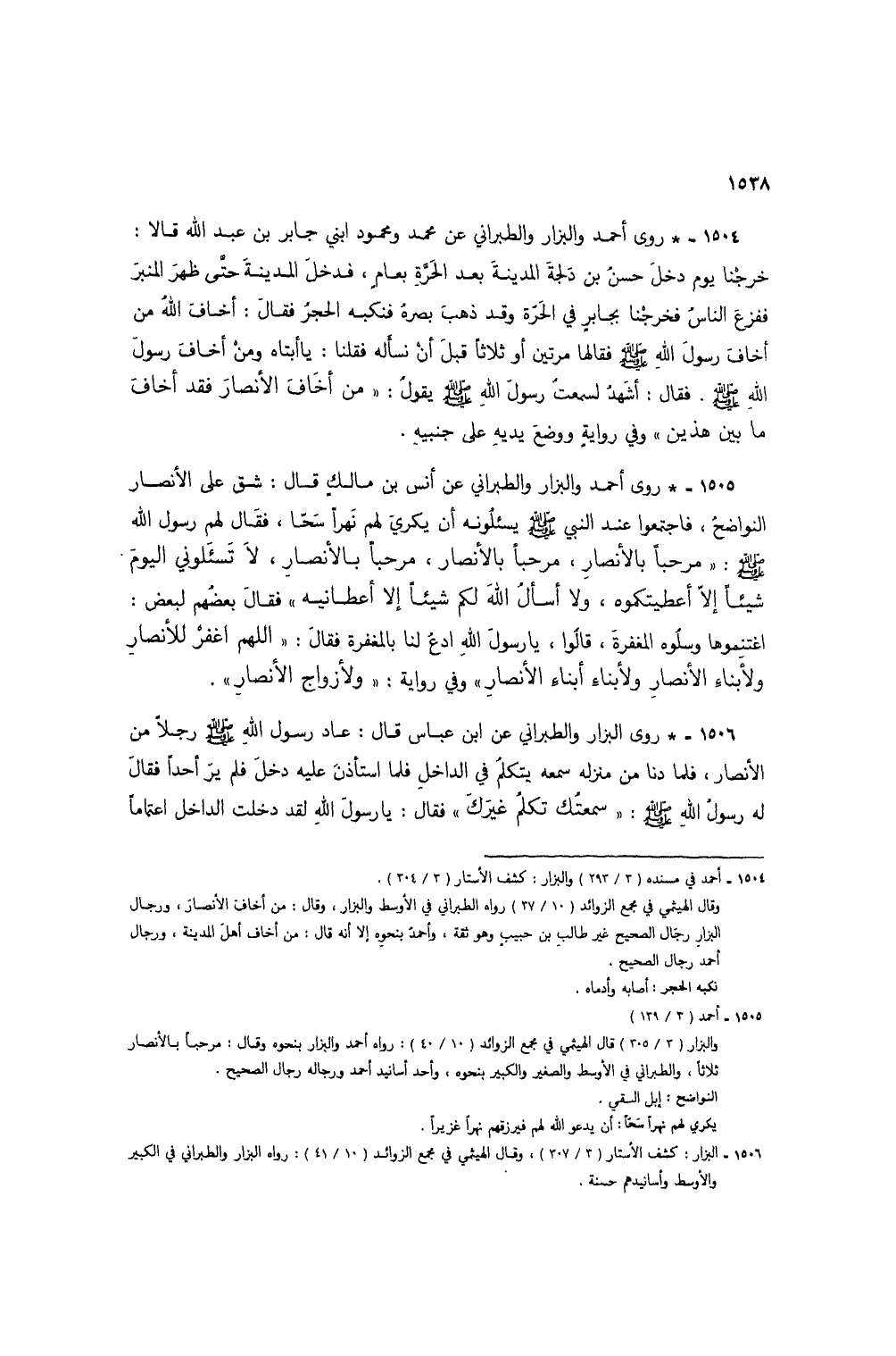 1505 - * روى أحمد والبزار والطبراني عن أنس بن مالك قال: شق على الأنصار النواضحُ، فاجتمعوا عند النبي صلى الله عليه وسلم يسئلُونه أن يكري لهم نهراً سحا، فقال لهم رسول الله صلى الله عليه وسلم: "مرحباً بالأنصار، مرحباً بالأنصار، مرحباً بالأنصار، لا تسئلوني اليوم شيئاً إلا أعطيتكموه، ولا أسألُ الله لكم شيئاً إلا أعطانيه" فقال بعضهم لبعض: اغتنموها وسلوه المغفرة، قالوا: يا رسول الله ادعُ لنا بالمغفرة فقال: "اللهم اغفر للأنصار ولأبناء الأنصار ولأبناء أبناء الأنصار" وفي رواية: "ولأزواج الأنصارِ".