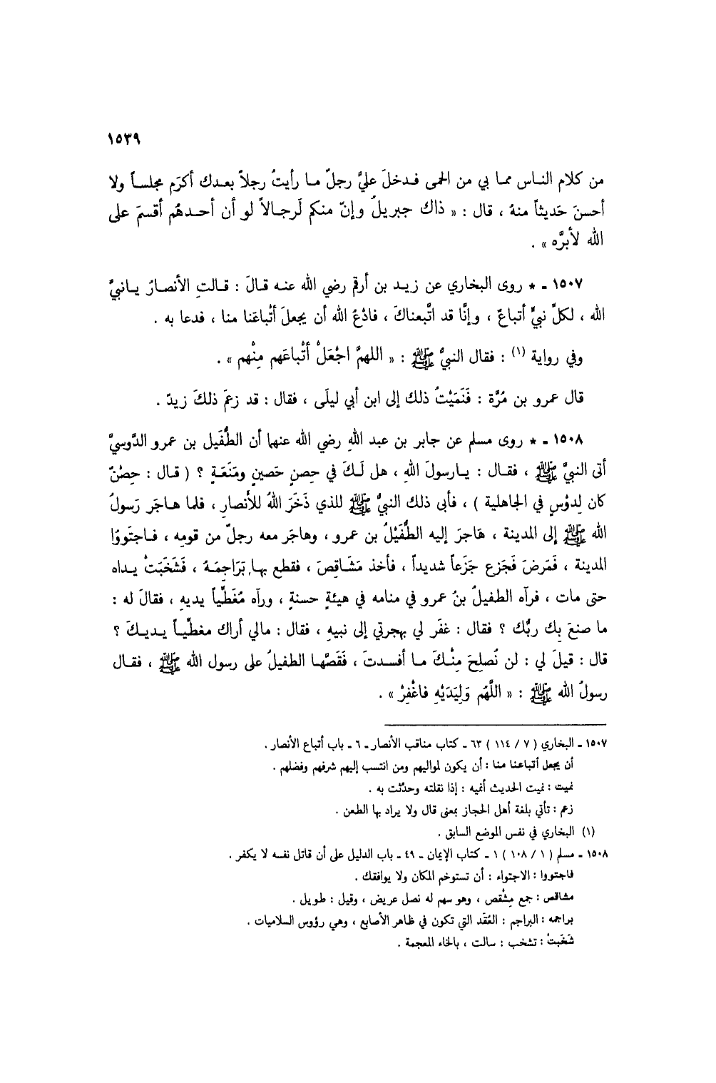 1508 - * روى مسلم عن جابر بن عبد الله رضي الله عنهما أن الطُّفيل بن عمرو الدَّوسي أتى النبي صلى الله عليه وسلم، فقال: يا رسول الله، هل لك في حصنٍ حصينٍ ومنعةٍ؟ (قال: حصنٌ كان لدوسٍ في الجاهلية)، فبى ذلك النبيُّ صلى الله عليه وسلم للذي ذَخَرَ الله للأنصار، فلما هاجر رسول الله صلى الله عليه وسلم إلى المدينة، هاجر إليه الطُّفيلُ بن عمرو، وهاجر معه رجلٌ من قومه، فاجتواُوا المدينة، فمرض فجزع جزعاً شديداً، فأخذ مشاقِصَ، فقطع بها براجمَهُ، فشخبَتْ يداه حتى مات، فرآه الطفيلُ بن عمرو في منامه في هيئةٍ حسنةٍ، ورآه مُغطياً يديه، فقال له: ما صنع بك ربُّك؟ فقال: غفر لي بهجرتي إلأى نبيه، فقال: مالي أراك مغطياً يديك؟ قال: قيل لي: لن نُصلح منك ما أفسدت، فقصها الطفيلُ على رسول الله صلى الله عليه وسلم، فقال رسول الله صلى الله عليه وسلم: "اللهم وليديه فاغفرْ".